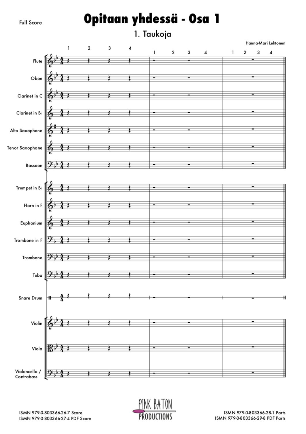 Wind instruments: Flute, Oboe, Clarinet in C & in Bb, Alto Saxophone Eb, Tenor Saxophone, Bassoon in C Trumpet in Bb, Horn in F, Trombone, Euphonium, Tuba Percussion: Snare Drum String Instruments: Violin, Viola, Violoncello / Contrabass