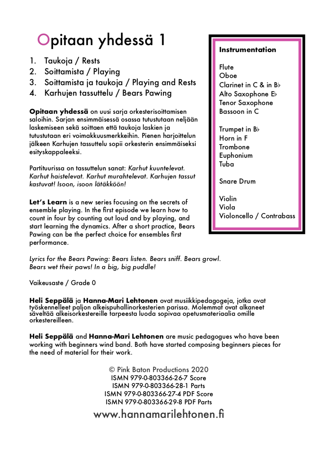 Let’s Learn is a new series focusing on the secrets of ensemble playing. In the first episode we learn how to count in four by counting out loud and by playing, and start learning the dynamics. After a short practice, Bears Pawing can be the perfect choice for ensembles first performance. Lyrics for the Bears Pawing: Bears listen. Bears sniff. Bears growl. Bears wet their paws! In a big, big puddle!