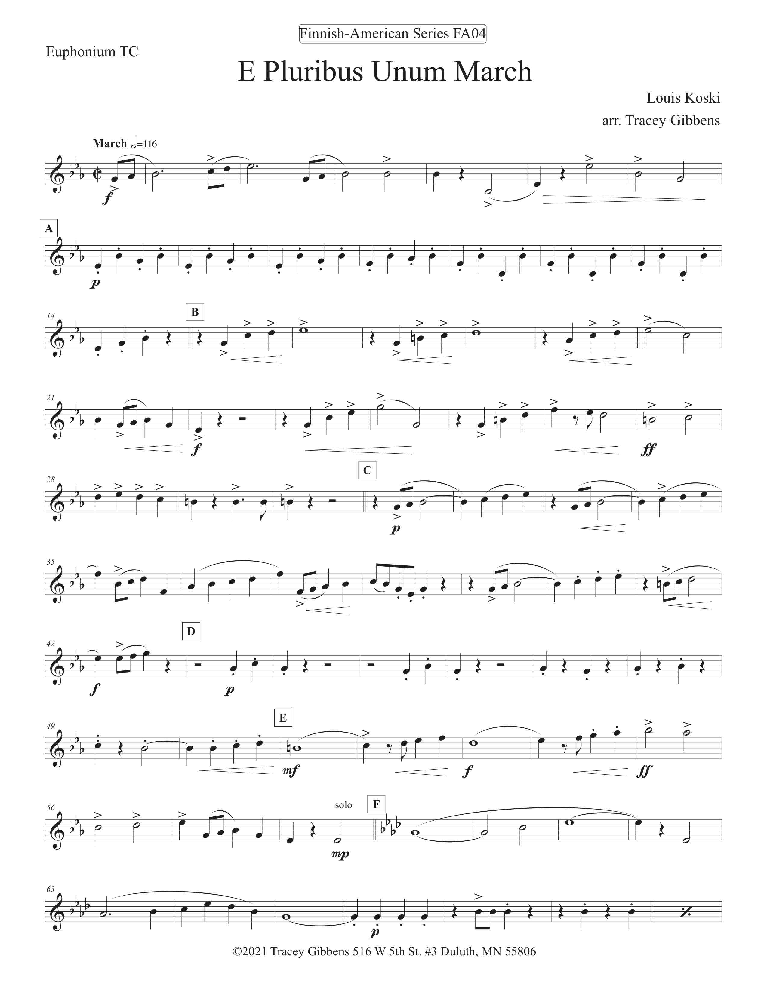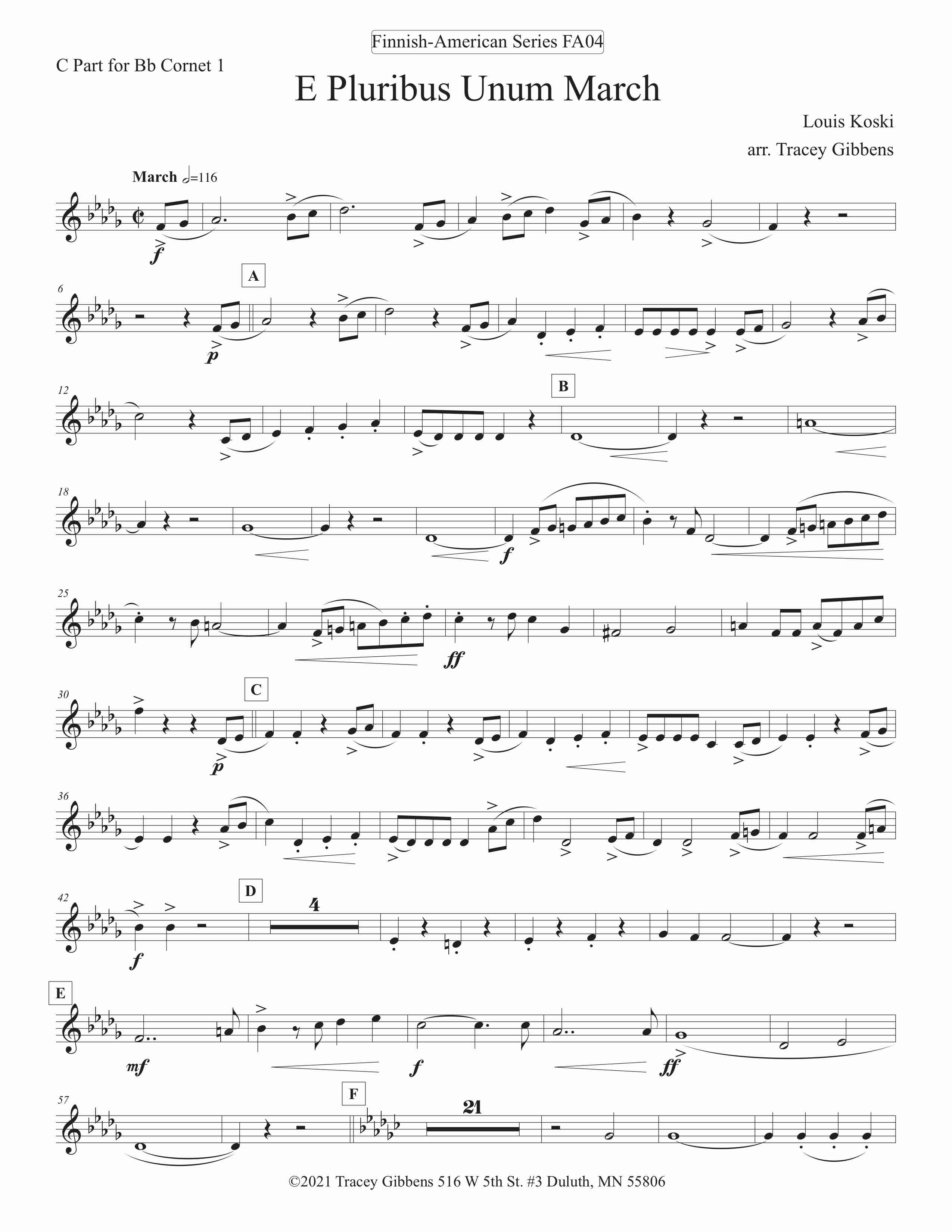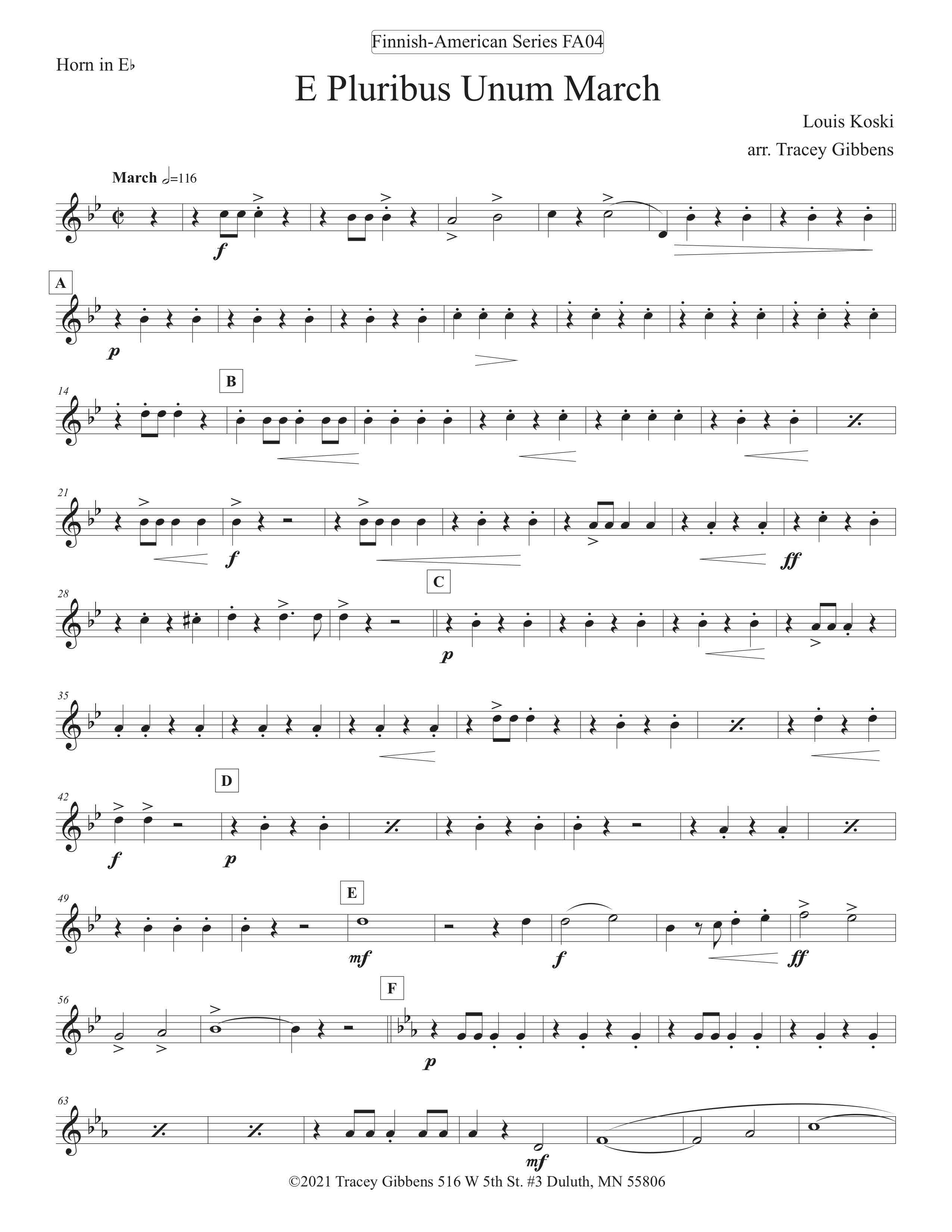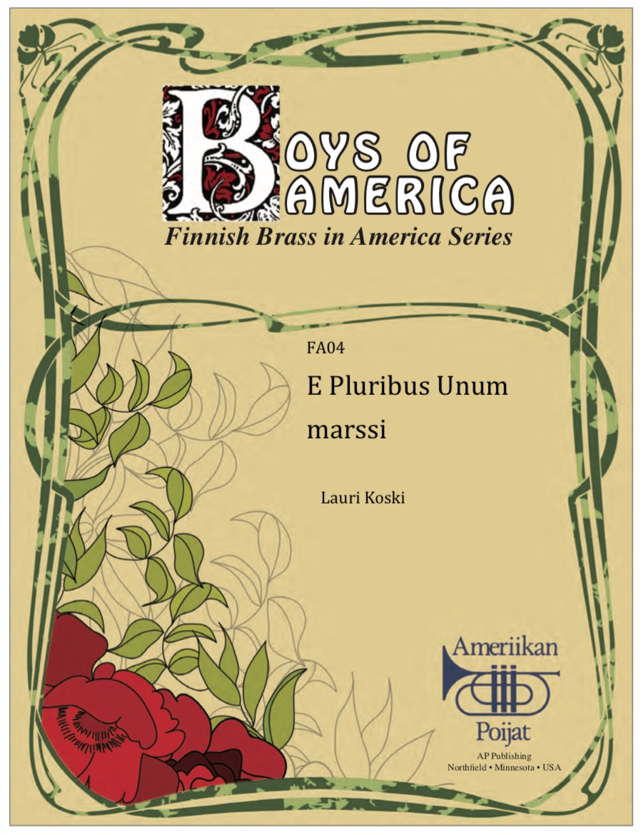 E Pluribus Unum March. Lauri (Louis) Koski was a very successful Finnish American bandmaster who was a key organizer of the Sibelius Seura (Sibelius Club) formed in Monessen, Pennsylvania in 1912. Sibelius Seura published a number of Finnish American compositions for band. Unfortunately, E Pluribus Unum was apparently never distributed. There are other examples of American patriotic tunes composed by Finnish American composers. The Finnish American bands participated regularly in American national celebrations, local celebrations, as well as Finnish observations.