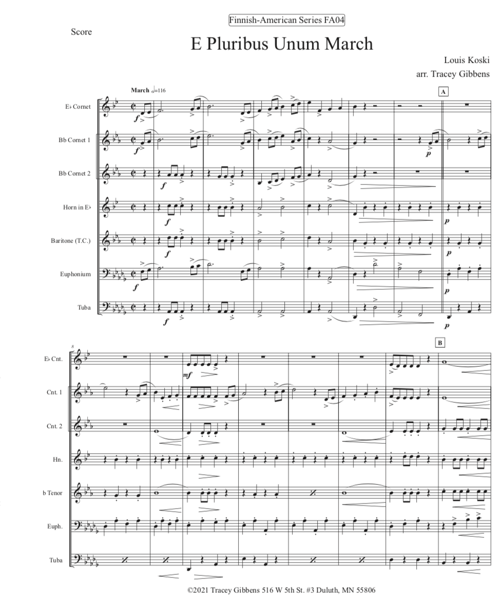 The Finnish Brass in America Series is scored primarily for original Finnish brass septet: E flat Soprano Cornet, two B flat Cornets, an E flat Alto Horn, a B flat Tenor Horn, and Euphonium, and a Tuba. However, these sets also include alternate parts for flute (piccolo), clarinet, French horn, and tenor saxophone. The original seven parts can also be played by other instrumentalists who read those clefs and transpositions (tenor saxophone, bassoon, bass clarinet, etc.) While many of us in Ameriikan poijat have contributed arrangements to this series, it has been primarily of work of Tracey Gibbens, with editing by Russell Pesola and Paul Niemisto.