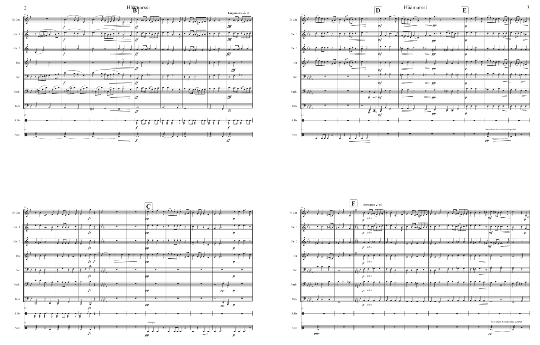 Standard Finnish septet : E-flat soprano cornet, B-flat cornet I, B-flat cornet II, E-flat alto, B-flat tenor , B-flat baritone, BB-tuba (concert pitch Bass Clef). Our wish is that brass players will try the conical brass instrumentation, but also welcome playing by mixed wind bands.