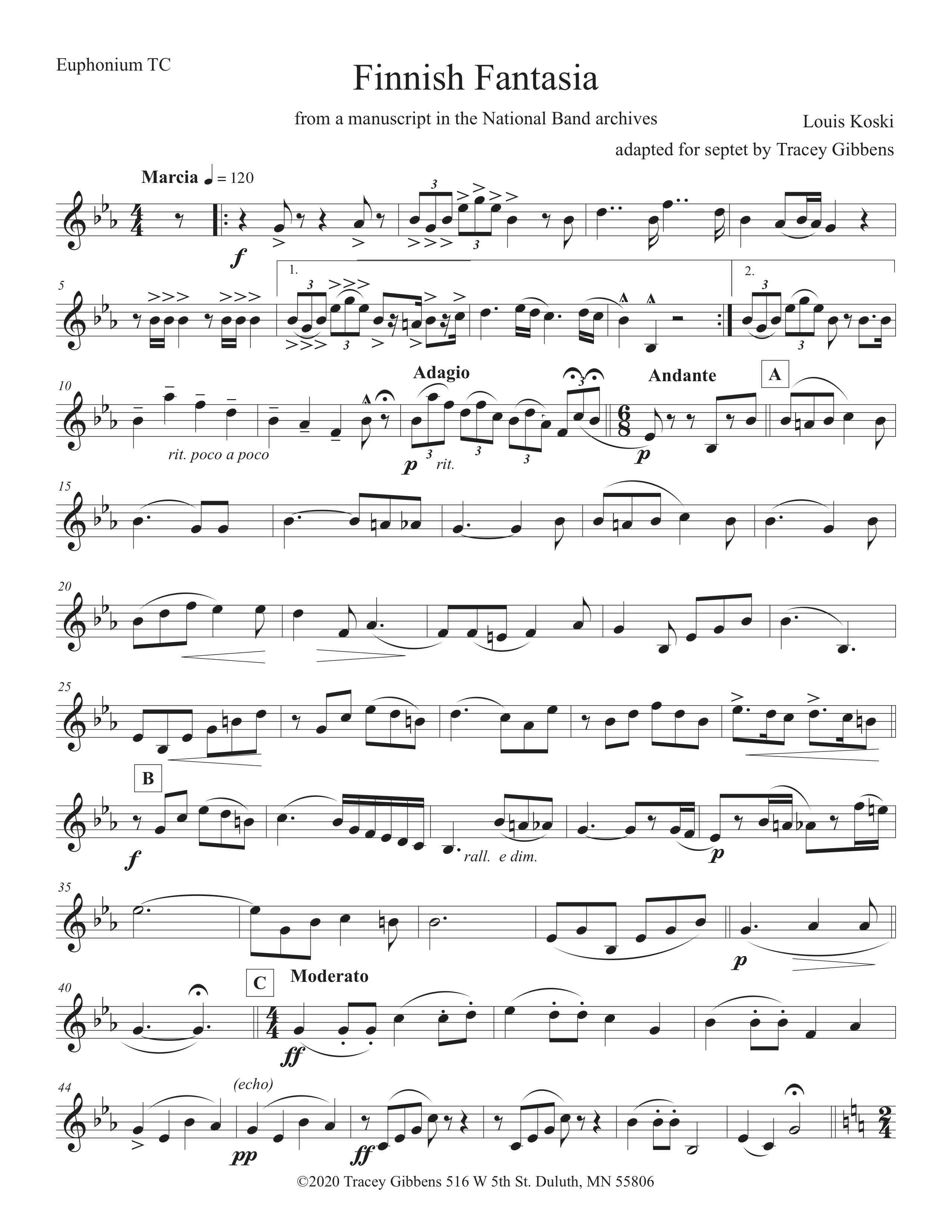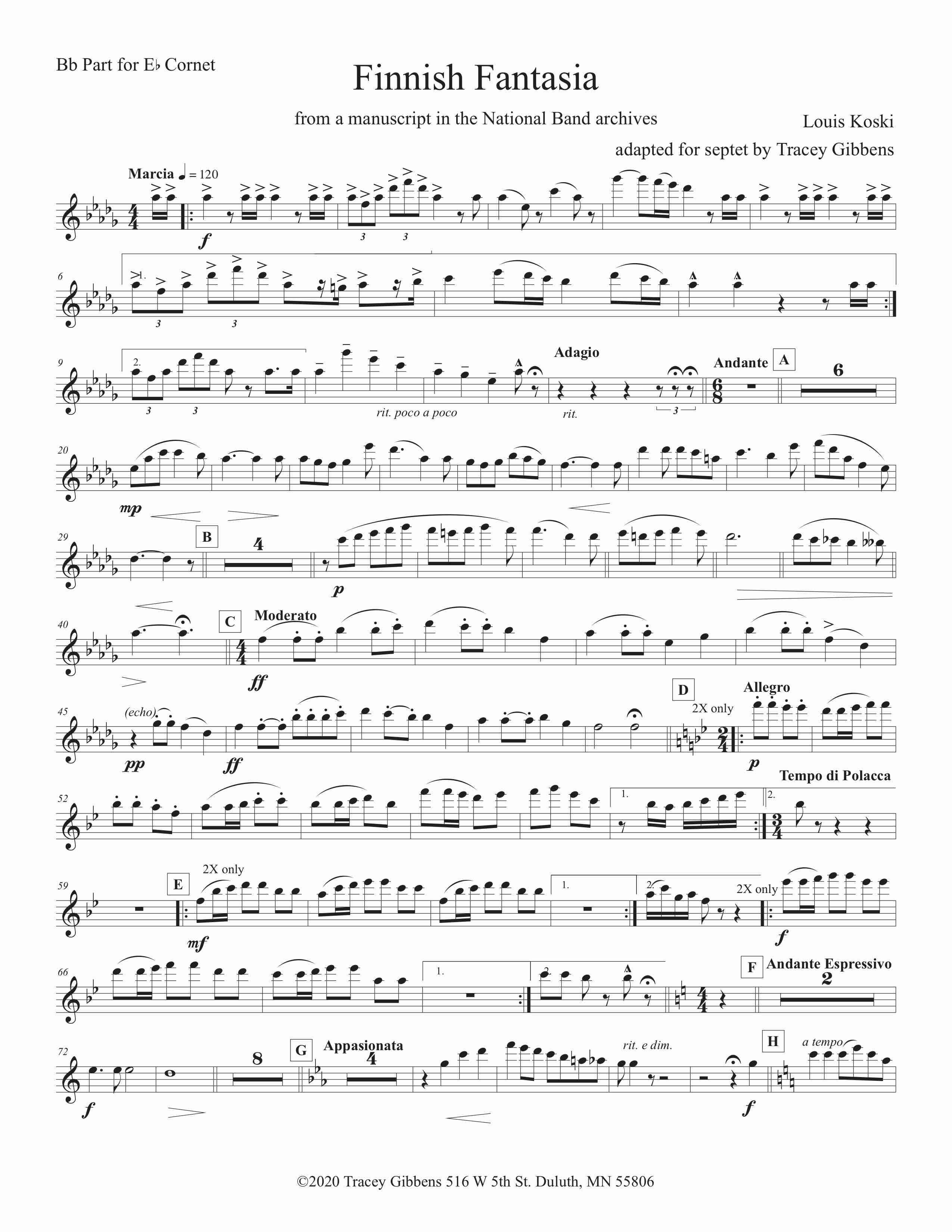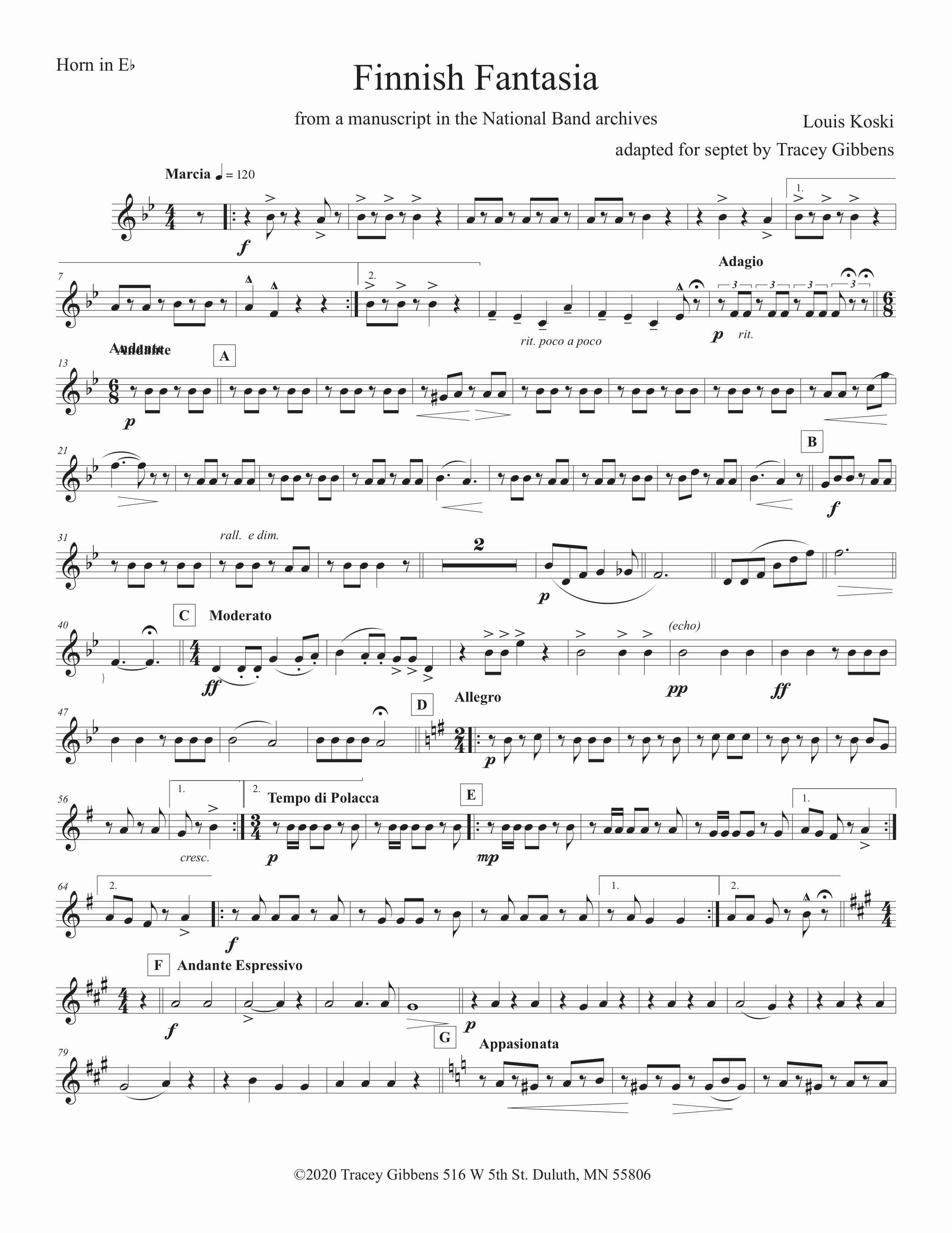 Finnish Fantasia written by Louis Koski was dedicated to the Finnish National Band of Maynard, Massachusetts. . Lauri (Louis) Koski was a very successful Finnish American bandmaster who was a key organizer of the Sibelius Seura (Sibelius Club) formed in Monessen, Pennsylvania in 1912. Sibelius Seura published a number of Finnish American compositions for band, including this one. Koski conducted Finnish bands in several settlements including Maynard, Massachusetts, which is where his buried. A considerable collection of his works in manuscript has been found.