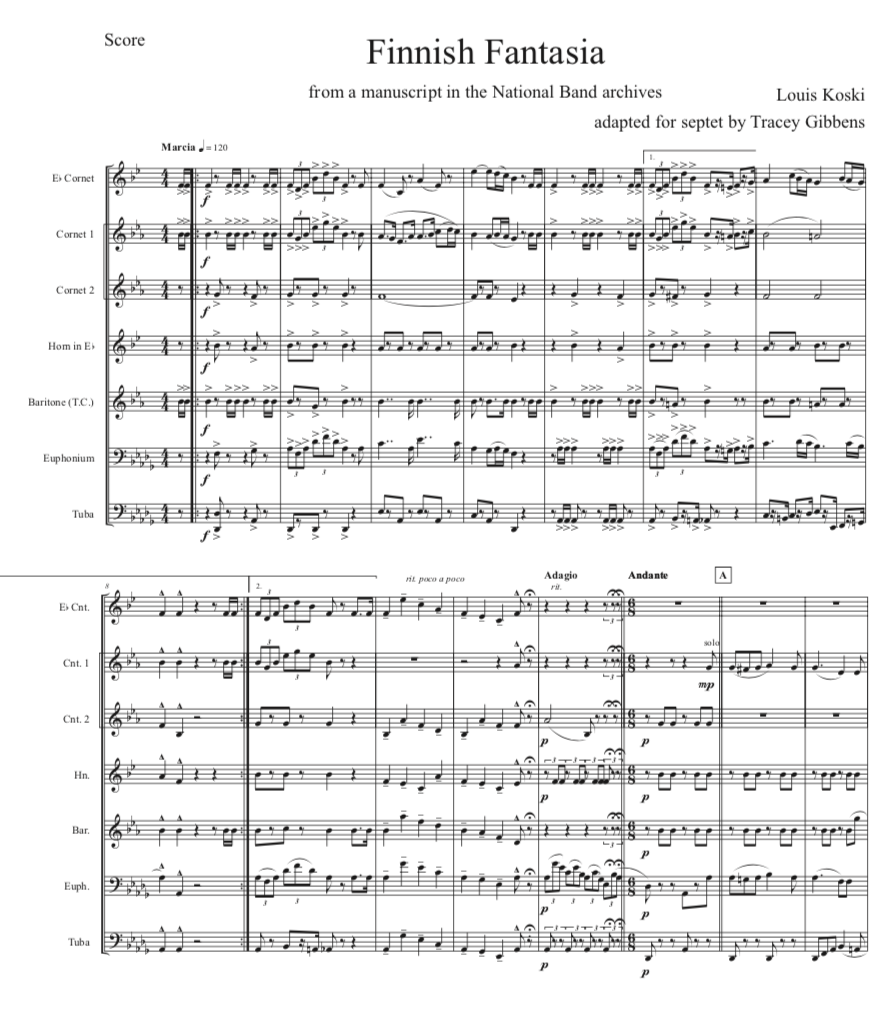 The Finnish Brass in America Series is scored primarily for original Finnish brass septet: E flat Soprano Cornet, two B flat Cornets, an E flat Alto Horn, a B flat Tenor Horn, and Euphonium, and a Tuba. However, these sets also include alternate parts for flute (piccolo), clarinet, French horn, and tenor saxophone. The original seven parts can also be played by other instrumentalists who read those clefs and transpositions (tenor saxophone, bassoon, bass clarinet, etc.) While many of us in Ameriikan poijat have contributed arrangements to this series, it has been primarily of work of Tracey Gibbens, with editing by Russell Pesola and Paul Niemisto.