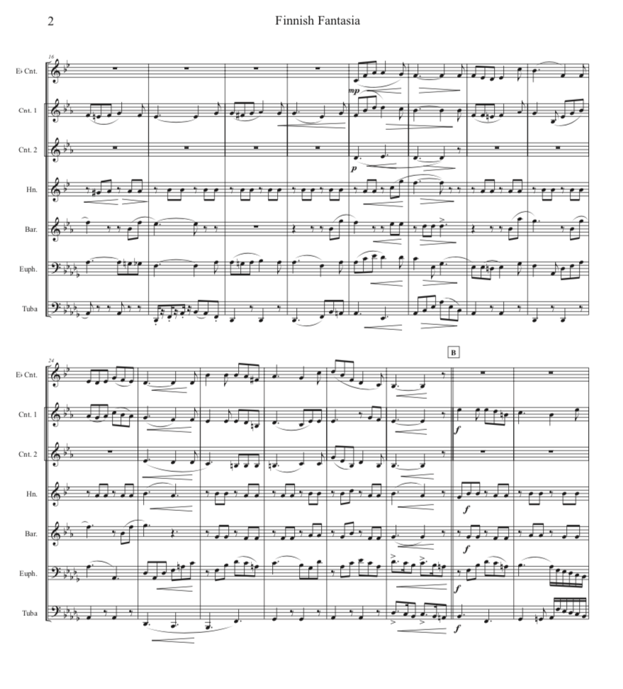 Standard Finnish septet : E-flat soprano cornet, B-flat cornet I, B-flat cornet II, E-flat alto, B-flat tenor , B-flat baritone, BB-tuba (concert pitch Bass Clef). Our wish is that brass players will try the conical brass instrumentation, but also welcome playing by mixed wind bands.