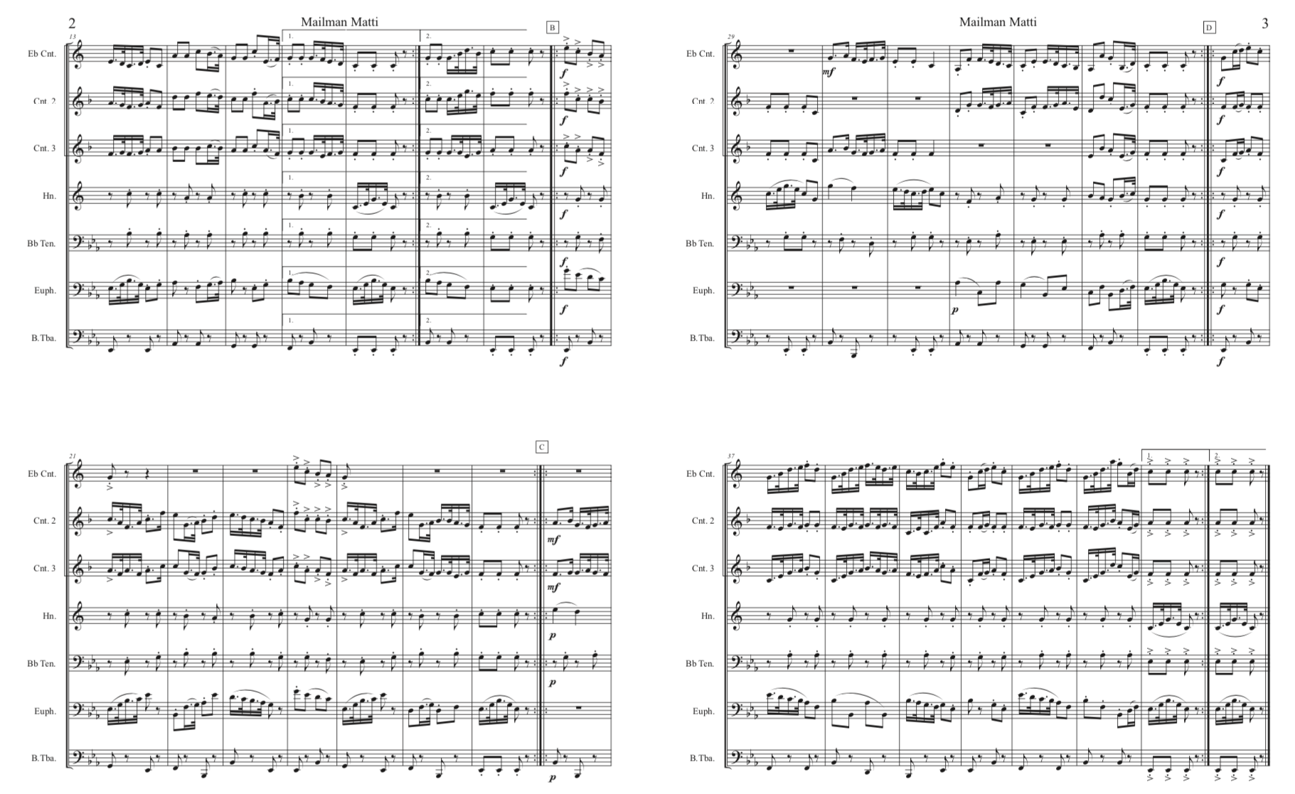 Standard Finnish septet : E-flat soprano cornet, B-flat cornet I, B-flat cornet II, E-flat alto, B-flat tenor , B-flat baritone, BB-tuba (concert pitch Bass Clef). Our wish is that brass players will try the conical brass instrumentation, but also welcome playing by mixed wind bands.