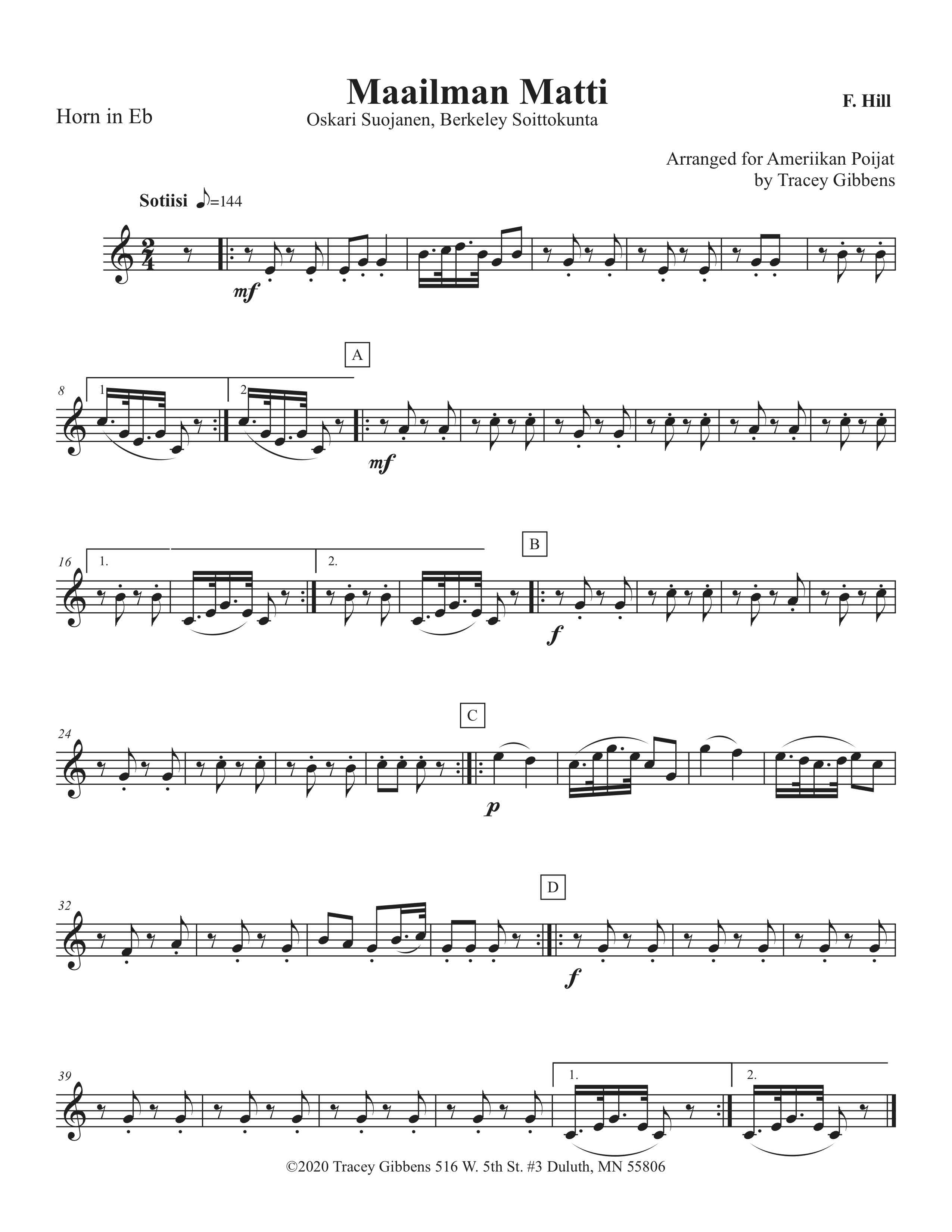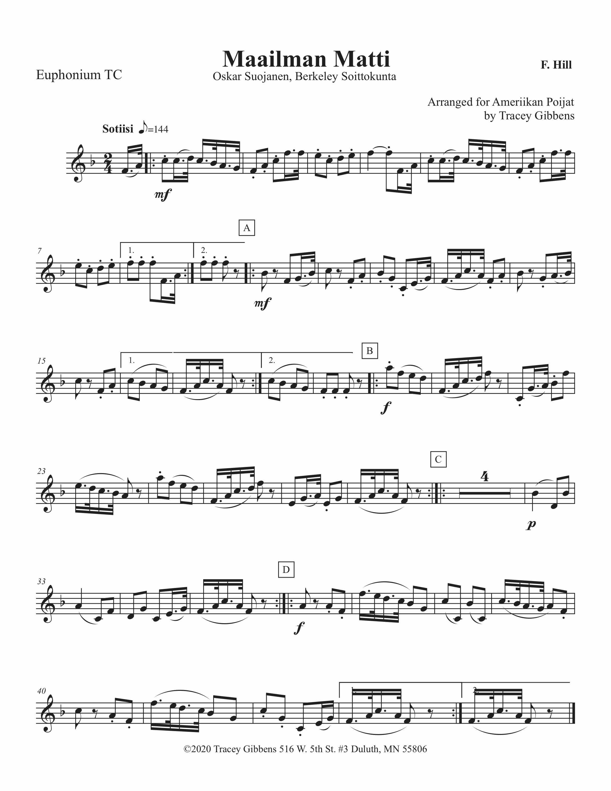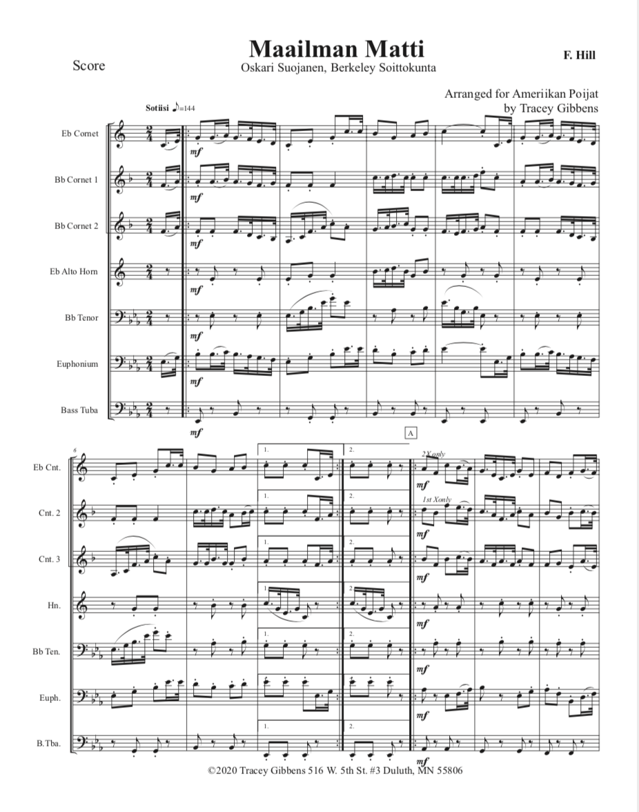The Finnish Brass in America Series is scored primarily for original Finnish brass septet: E flat Soprano Cornet, two B flat Cornets, an E flat Alto Horn, a B flat Tenor Horn, and Euphonium, and a Tuba. However, these sets also include alternate parts for flute (piccolo), clarinet, French horn, and tenor saxophone. The original seven parts can also be played by other instrumentalists who read those clefs and transpositions (tenor saxophone, bassoon, bass clarinet, etc.) While many of us in Ameriikan poijat have contributed arrangements to this series, it has been primarily of work of Tracey Gibbens, with editing by Russell Pesola and Paul Niemisto.