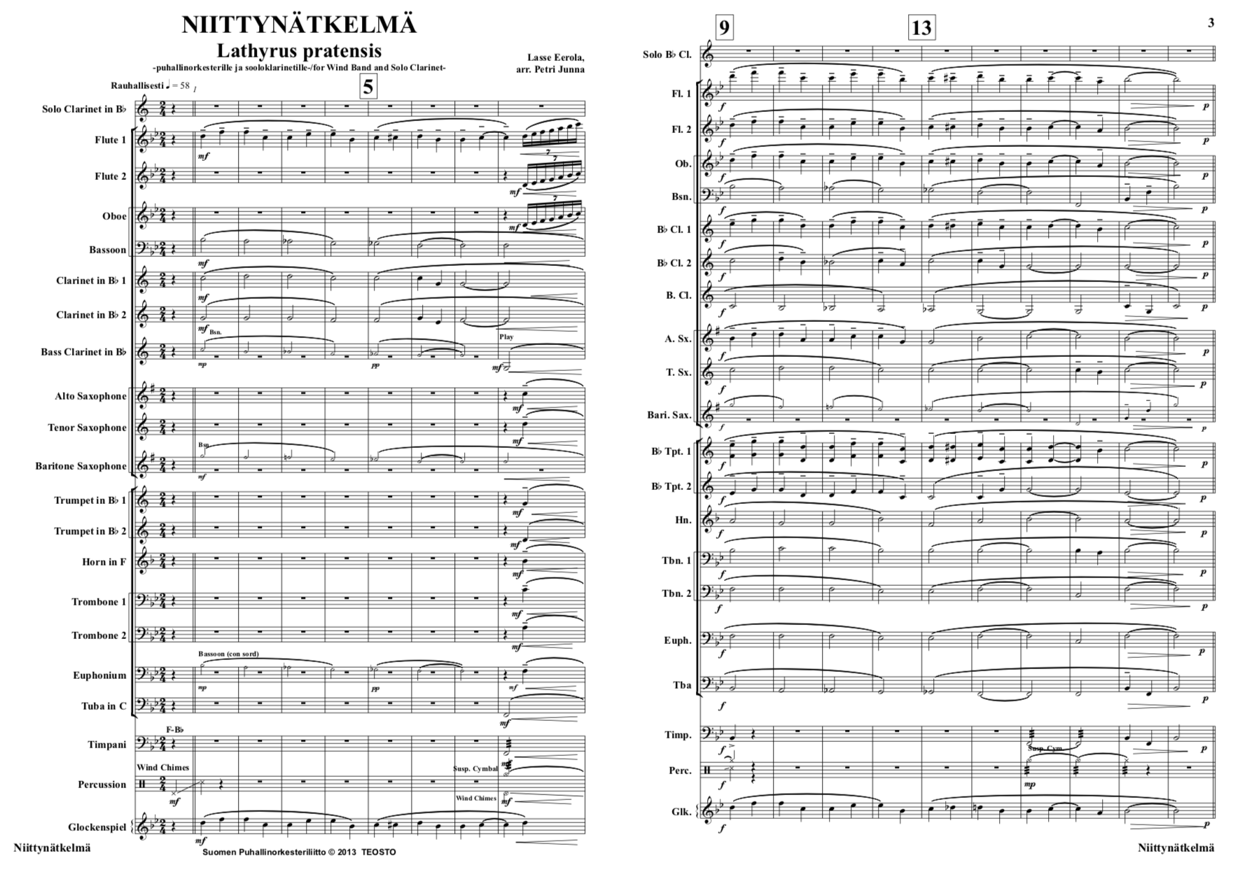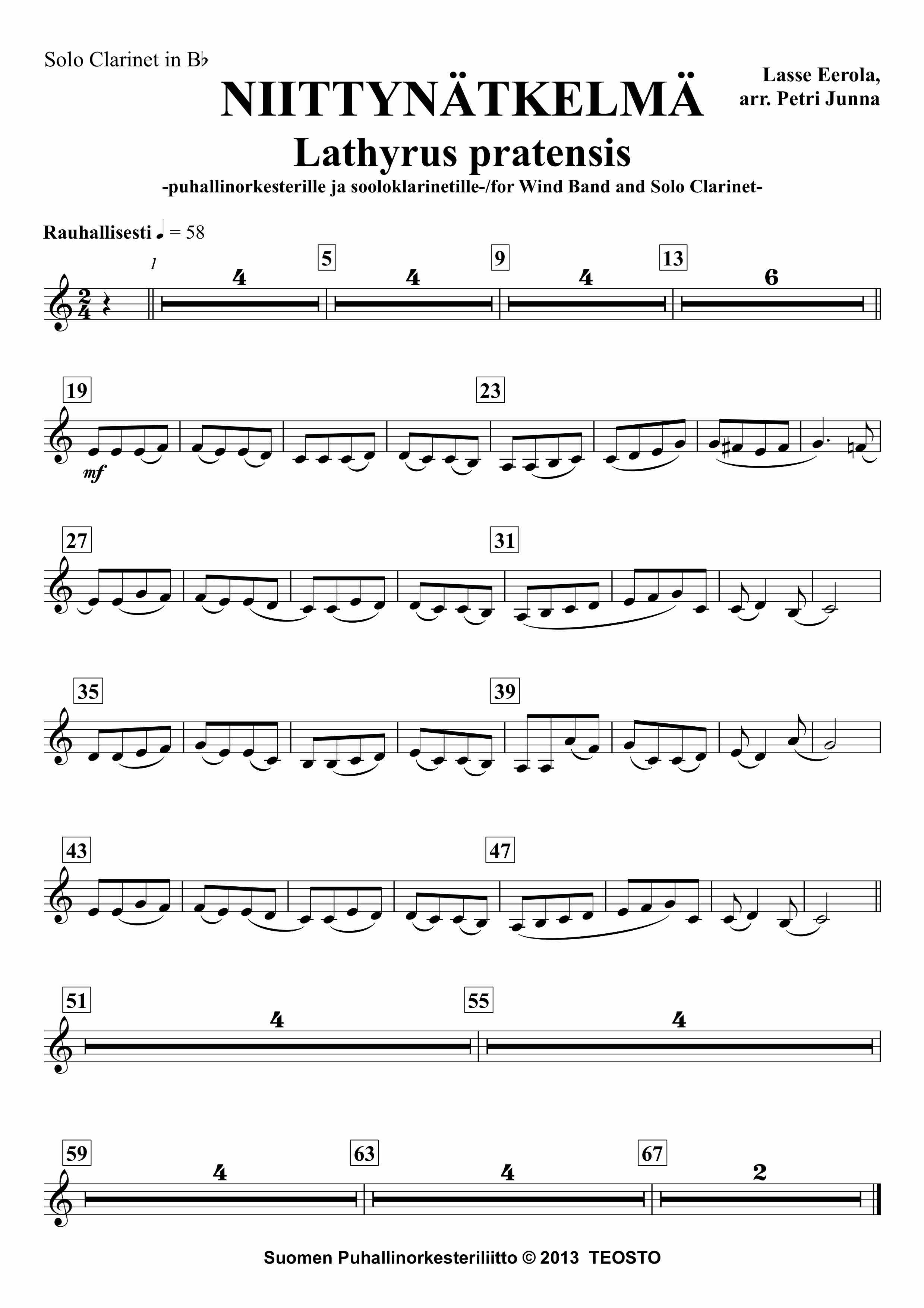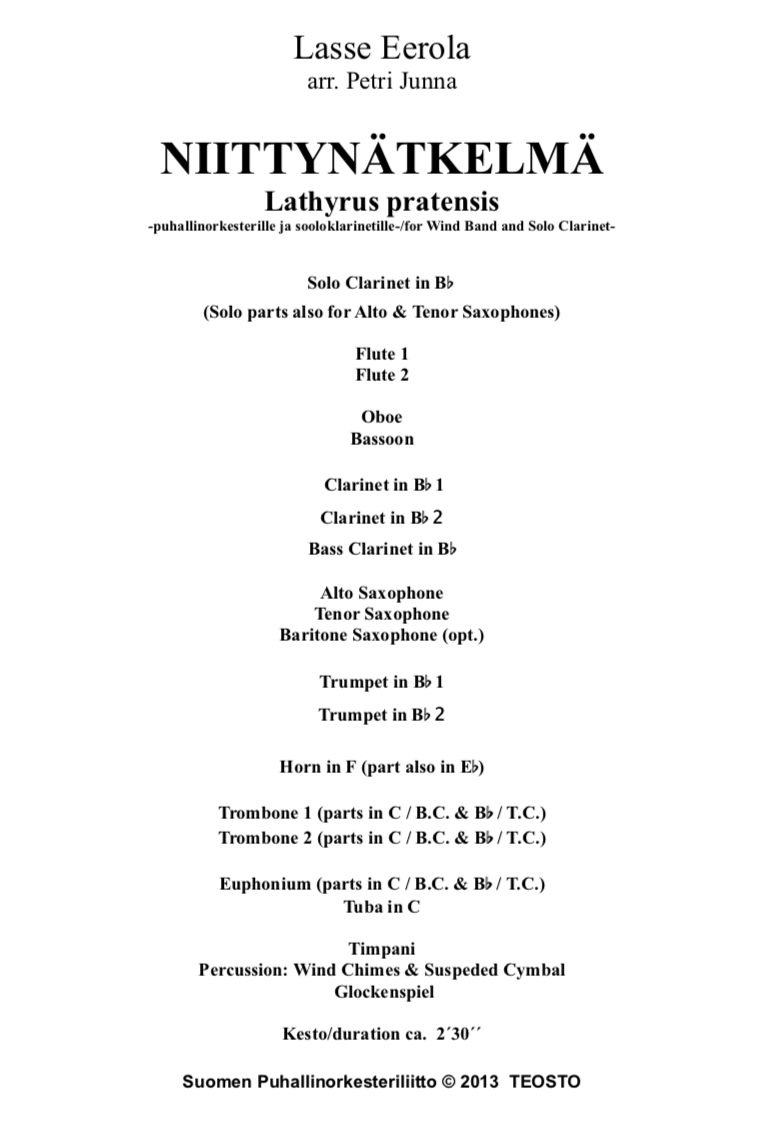 Niittynätkelmä/Lathyrus pratensis by Lasse Eerola, arr. Petri Junna puhallinorkesterille ja sooloklarinetille-for Wind Band and Solo Clarinet