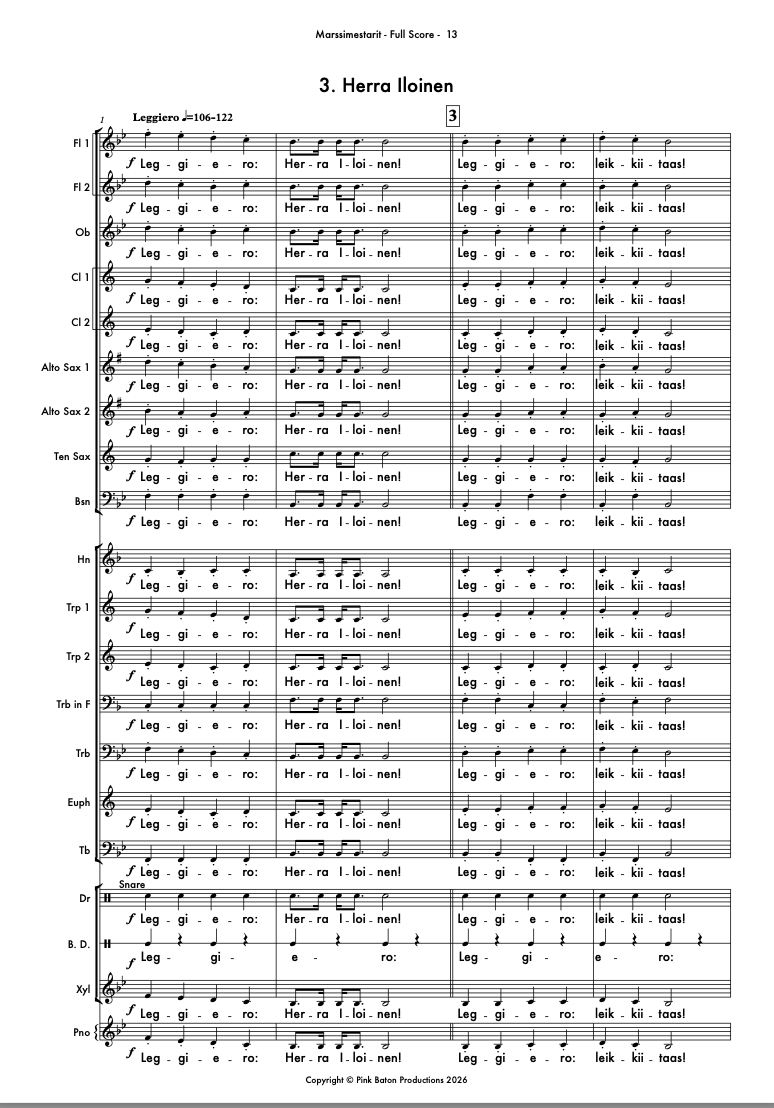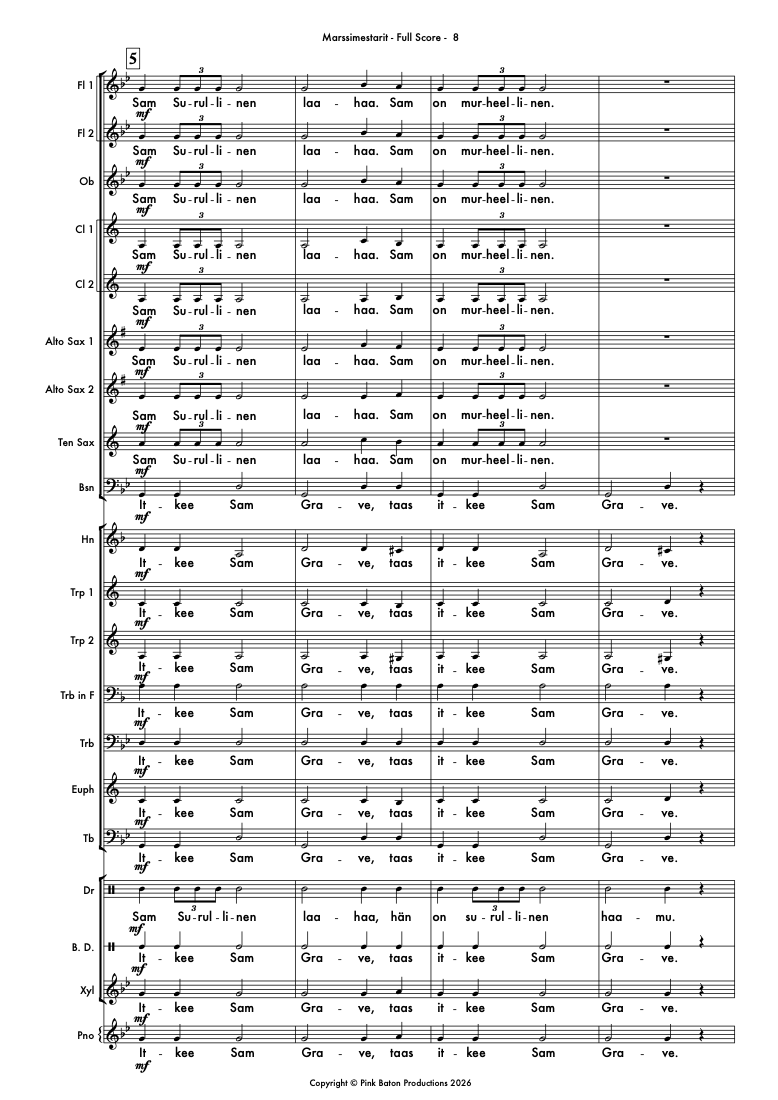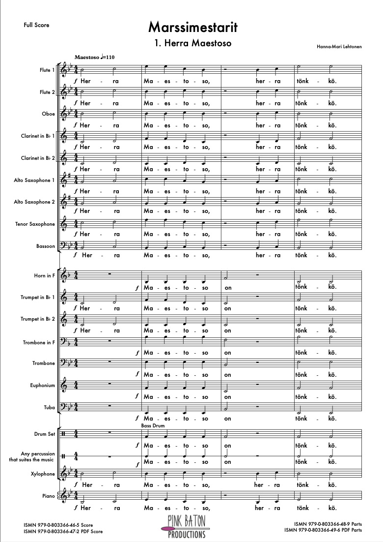 Orchestration / Orkestraatio Wind Instruments: Flute 1 & 2, Oboe, Clarinet in Bb 1 & 2, Alto Saxophone in Eb 1 & 2, Tenor Saxophone in Bb, Bassoon in C, Horn in F, Trumpet in Bb 1 & 2, Trombone in F, Trombone BC, Euphonium TC, Tuba Percussion: Drum Set, Any percussion instrument that suites the music, Xylophone Other: Piano (right hand)