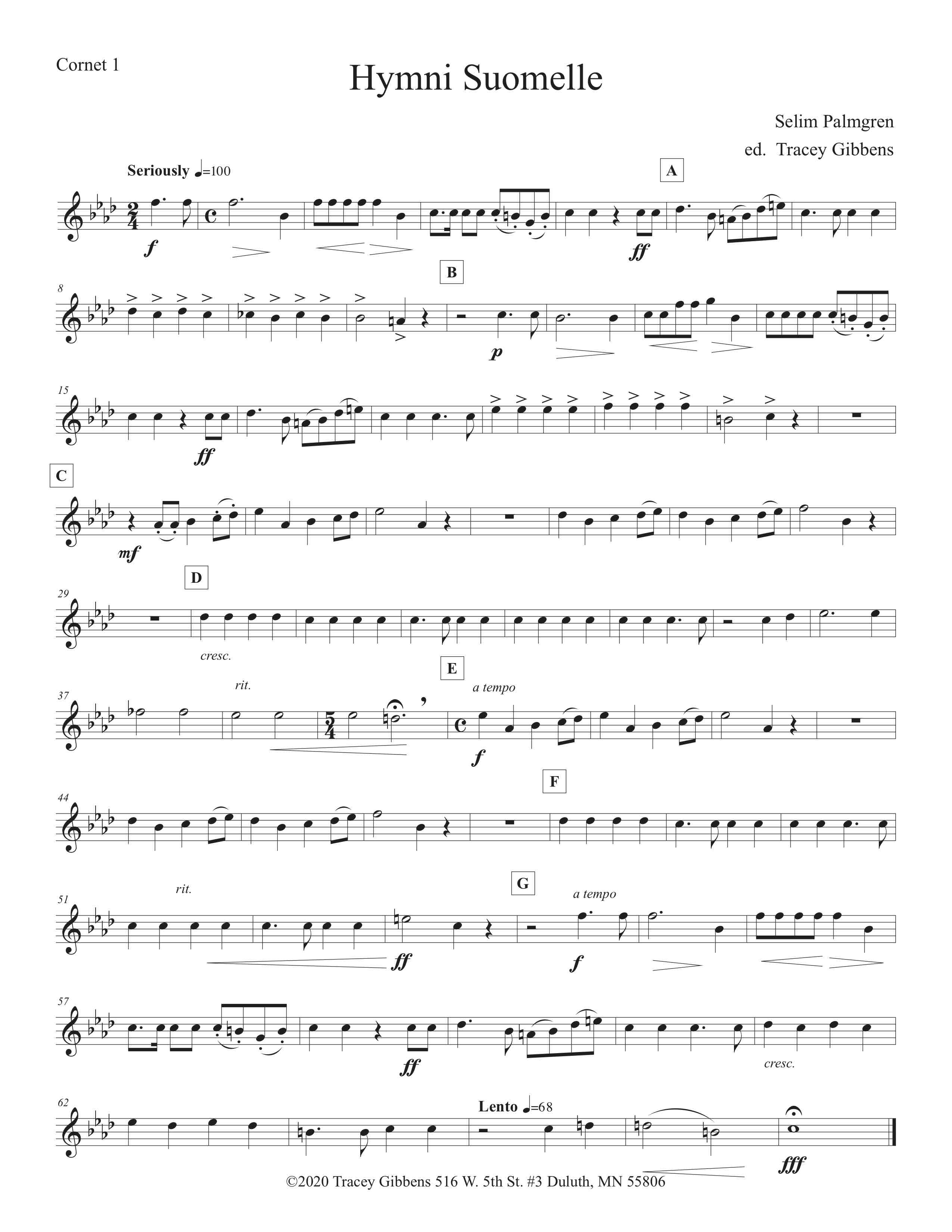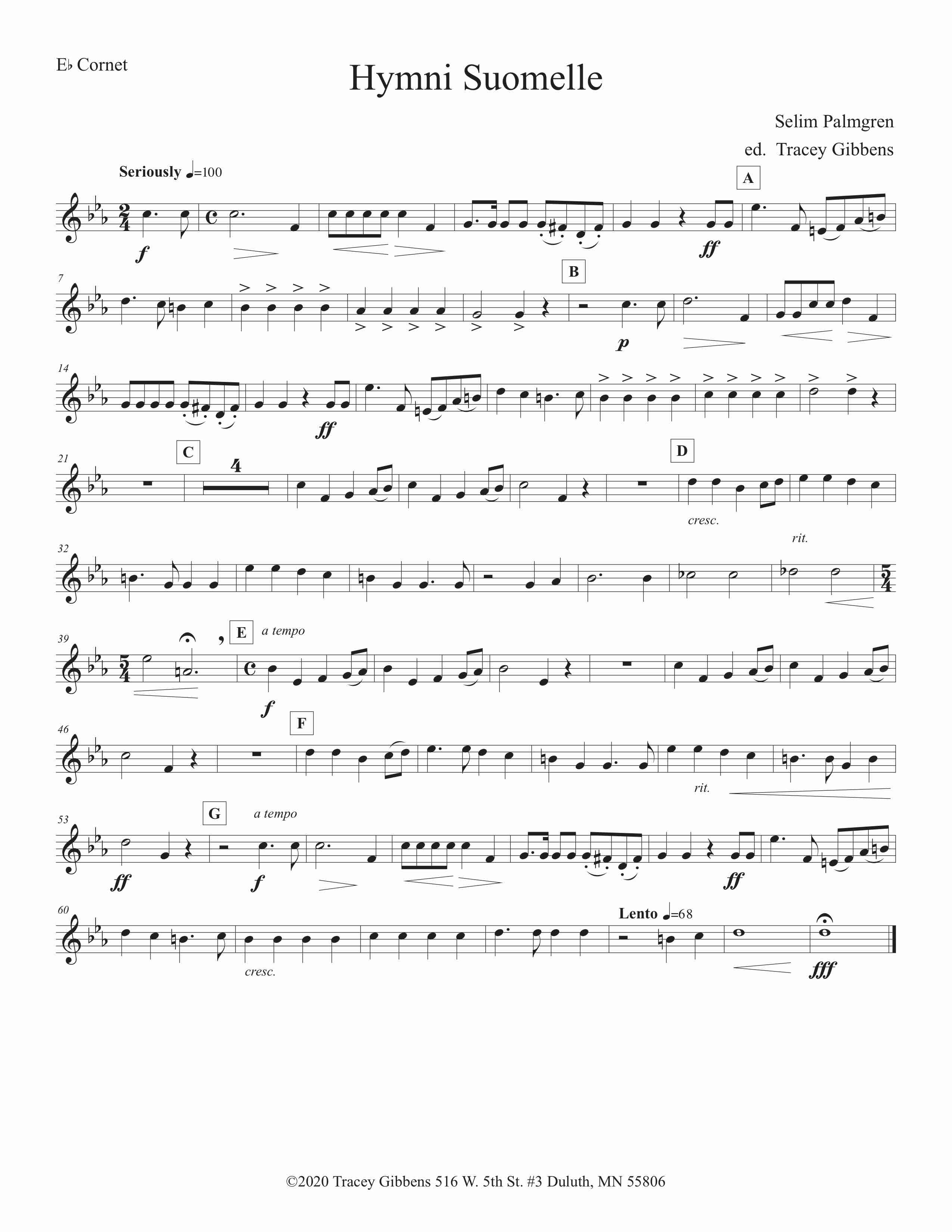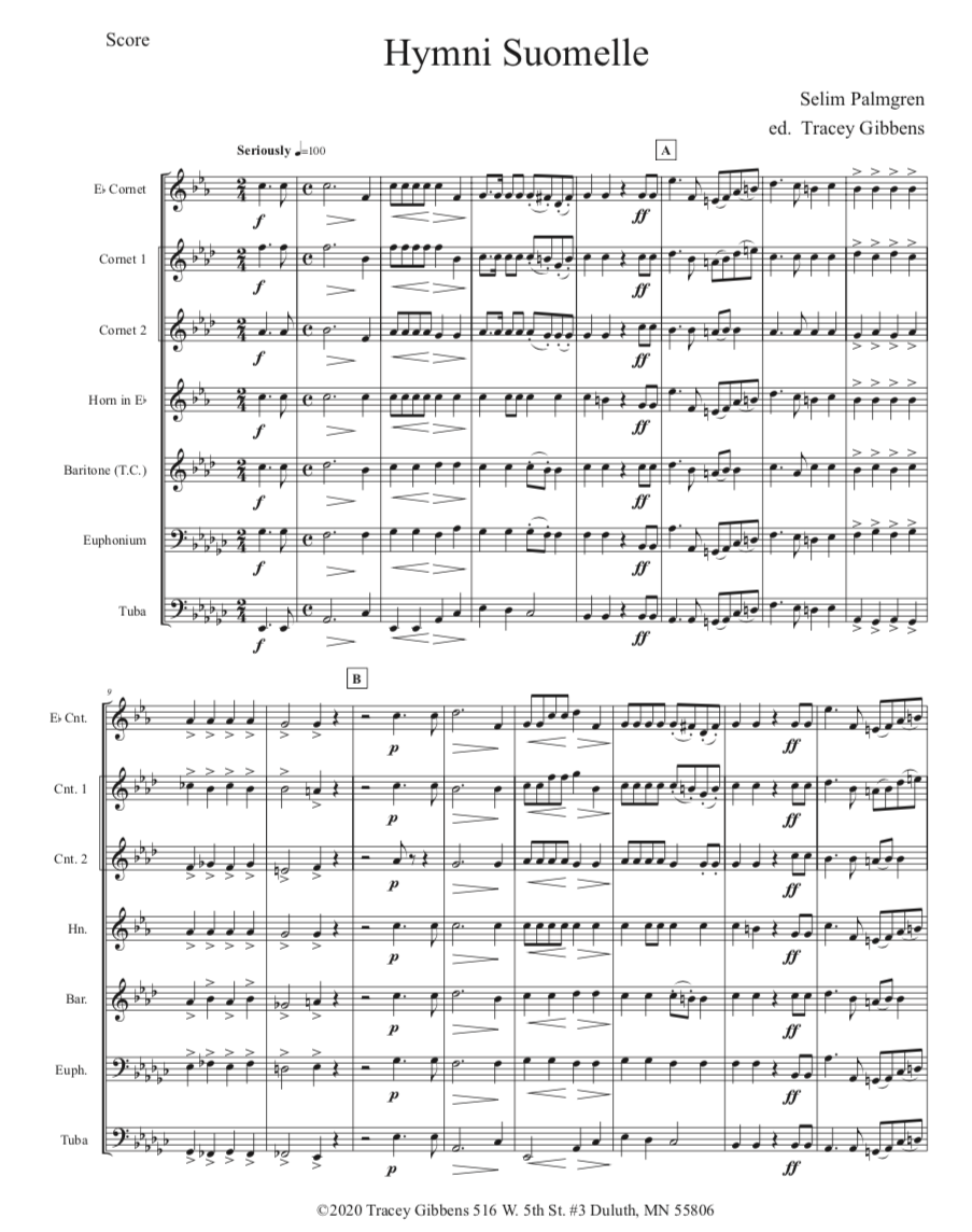 The Finnish Brass in America Series is scored primarily for original Finnish brass septet: E flat Soprano Cornet, two B flat Cornets, an E flat Alto Horn, a B flat Tenor Horn, and Euphonium, and a Tuba. However, these sets also include alternate parts for flute (piccolo), clarinet, French horn, and tenor saxophone. The original seven parts can also be played by other instrumentalists who read those clefs and transpositions (tenor saxophone, bassoon, bass clarinet, etc.) While many of us in Ameriikan poijat have contributed arrangements to this series, it has been primarily of work of Tracey Gibbens, with editing by Russell Pesola and Paul Niemisto.