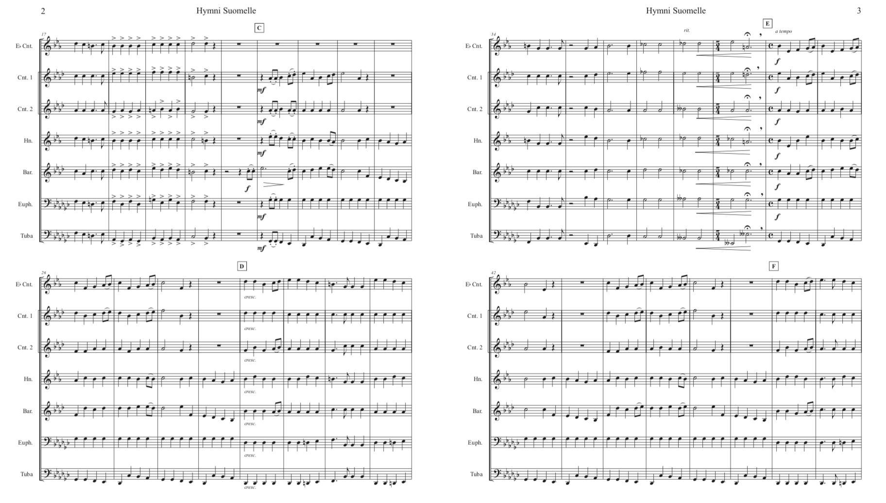 Standard Finnish septet : E-flat soprano cornet, B-flat cornet I, B-flat cornet II, E-flat alto, B-flat tenor , B-flat baritone, BB-tuba (concert pitch Bass Clef). Our wish is that brass players will try the conical brass instrumentation, but also welcome playing by mixed wind bands.