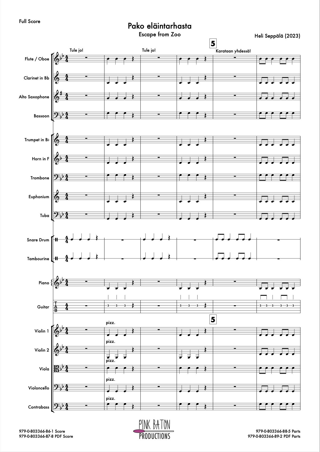 Orchestration / Orkestraatio: Wind instruments: Flute / Oboe, Clarinet in Bb, Alto Saxophone Eb, Bassoon in C, Trumpet in Bb, Horn in F, Trombone BC, Tuba Percussion: Snare Drum, Tambourine String instruments: Violin 1, Violin 2, Viola, Violoncello, Contrabass