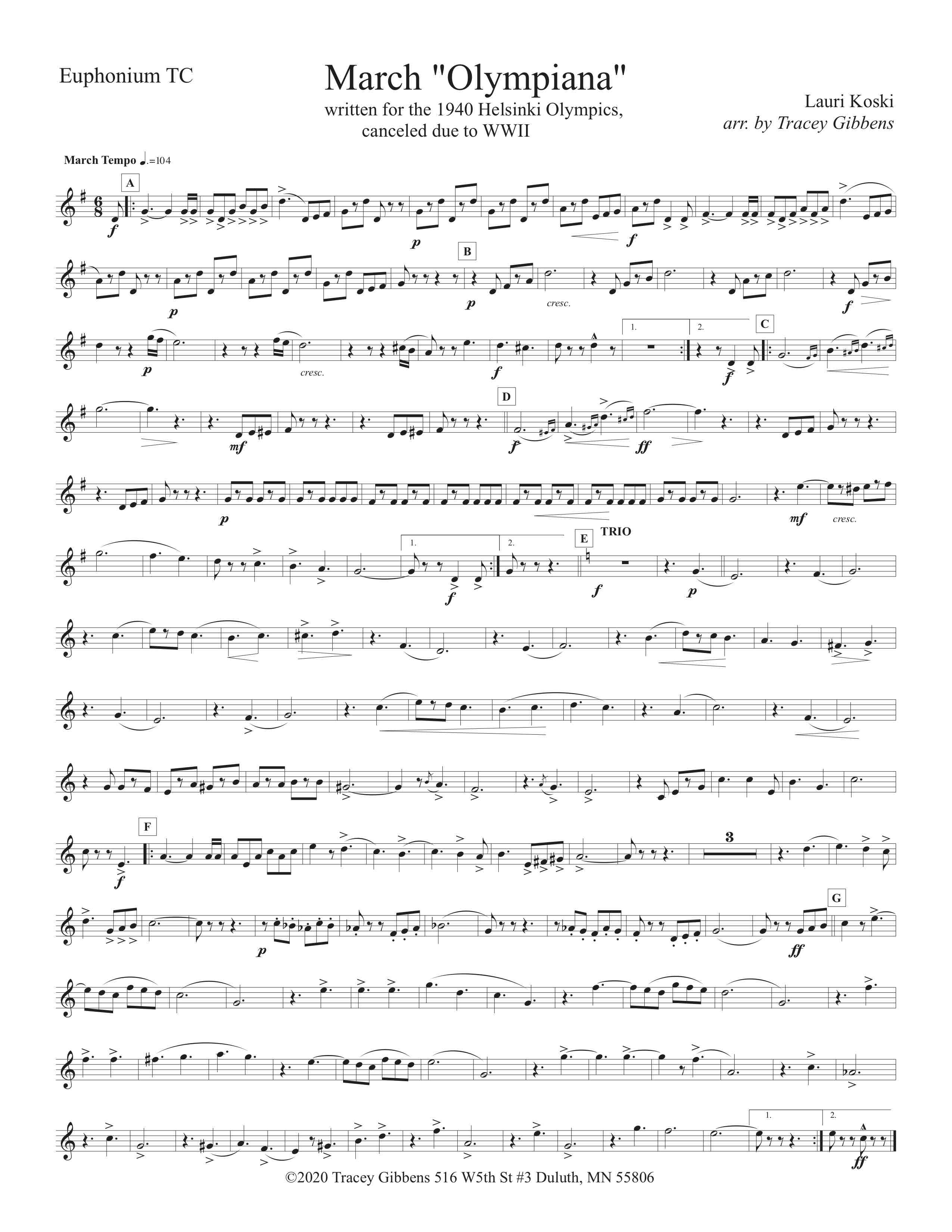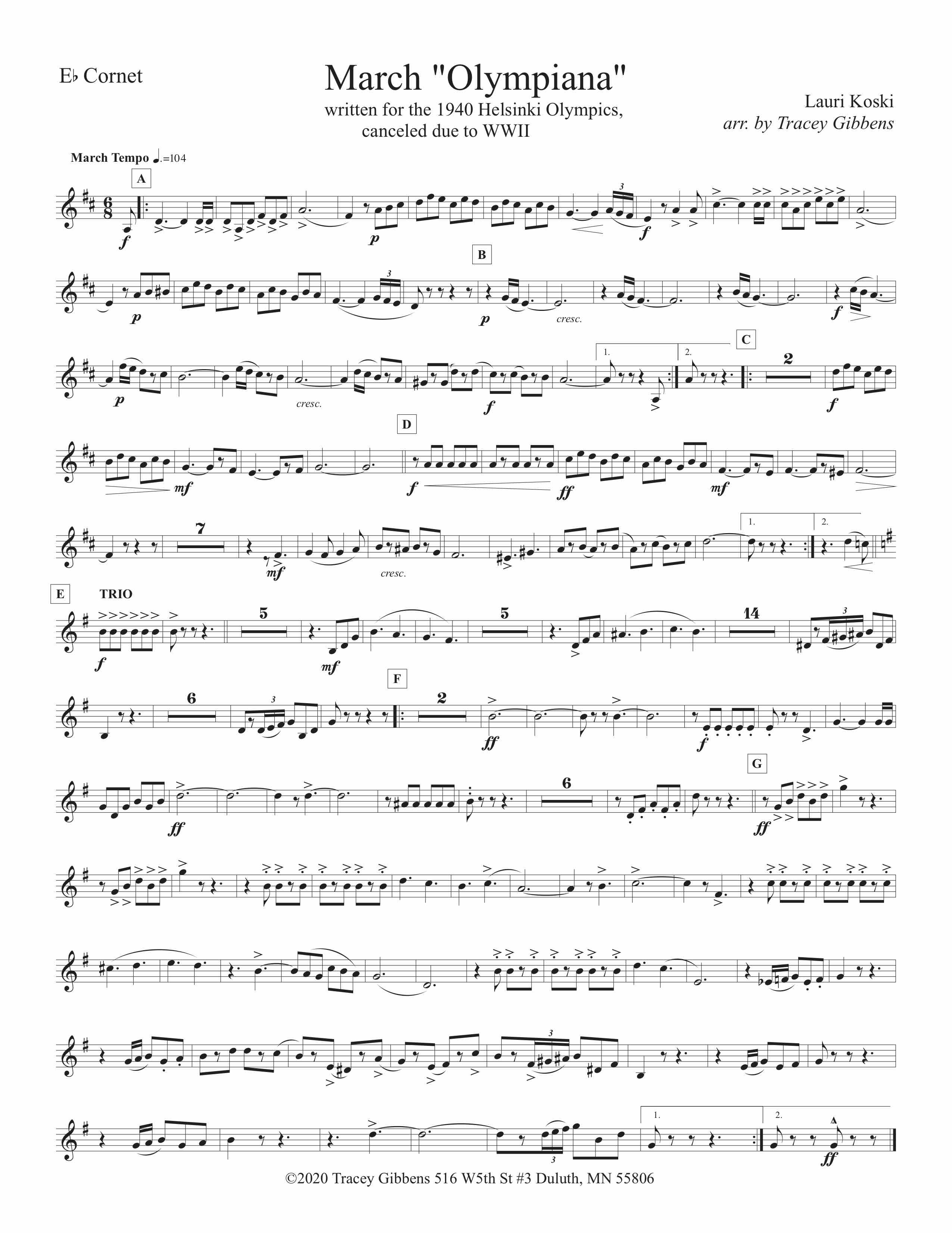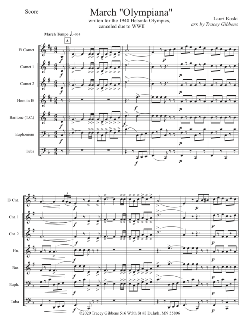 Olympiana March was written by Lauri Koski while he was a bandmaster in Massachusetts. It was composed in anticipation of the Helsinki Olympics, which were planned for 1940. Those Olympic Games were cancelled because of the onslaught of the Second World War, and the march was never performed, although Helsinki subsequently did host the Summer Olympics in post- war 1952.