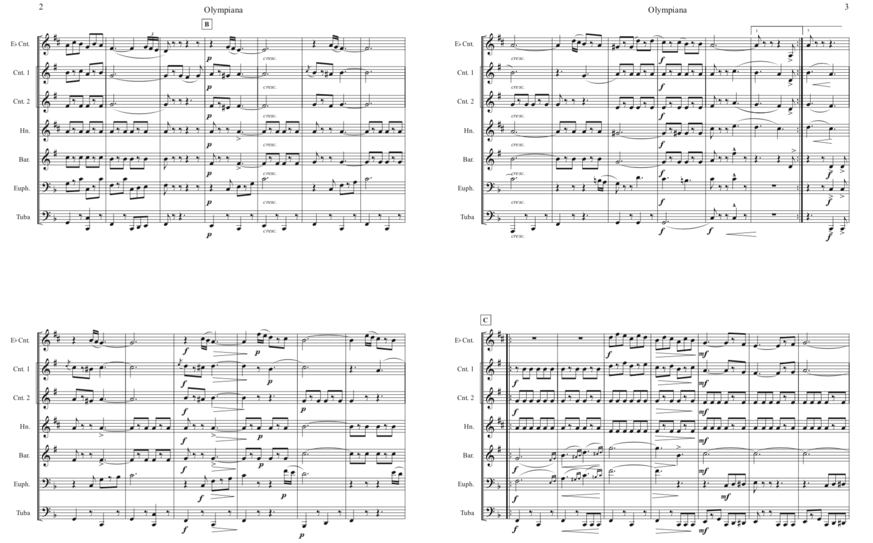 Standard Finnish septet : E-flat soprano cornet, B-flat cornet I, B-flat cornet II, E-flat alto, B-flat tenor , B-flat baritone, BB-tuba (concert pitch Bass Clef). Our wish is that brass players will try the conical brass instrumentation, but also welcome playing by mixed wind bands.