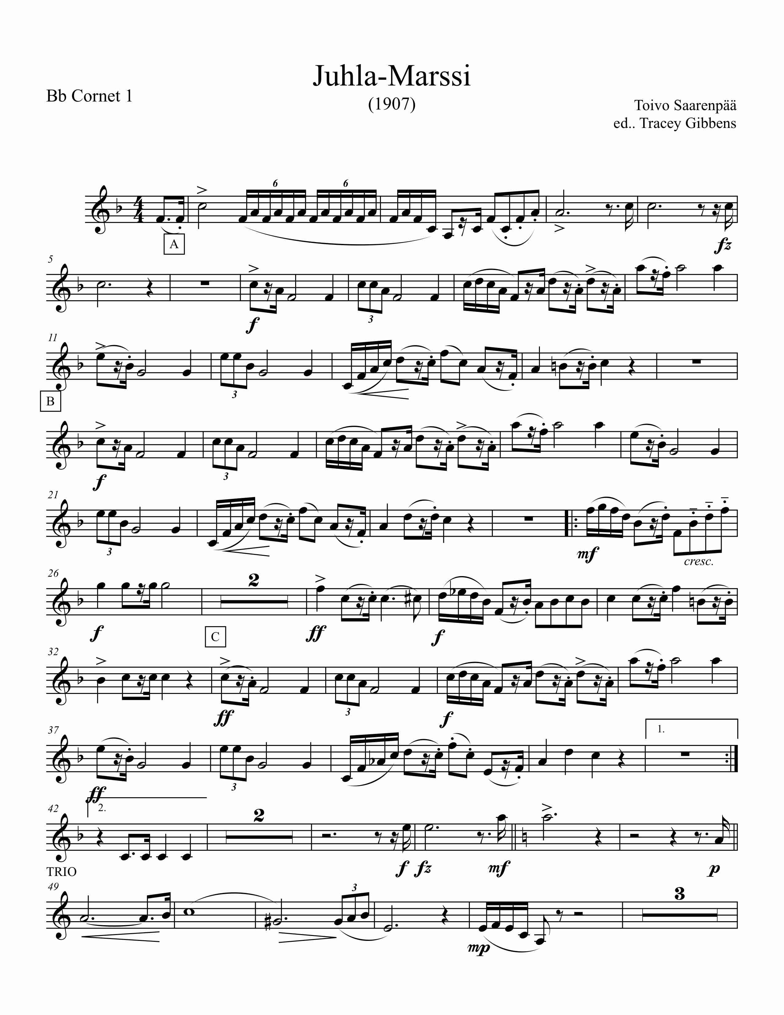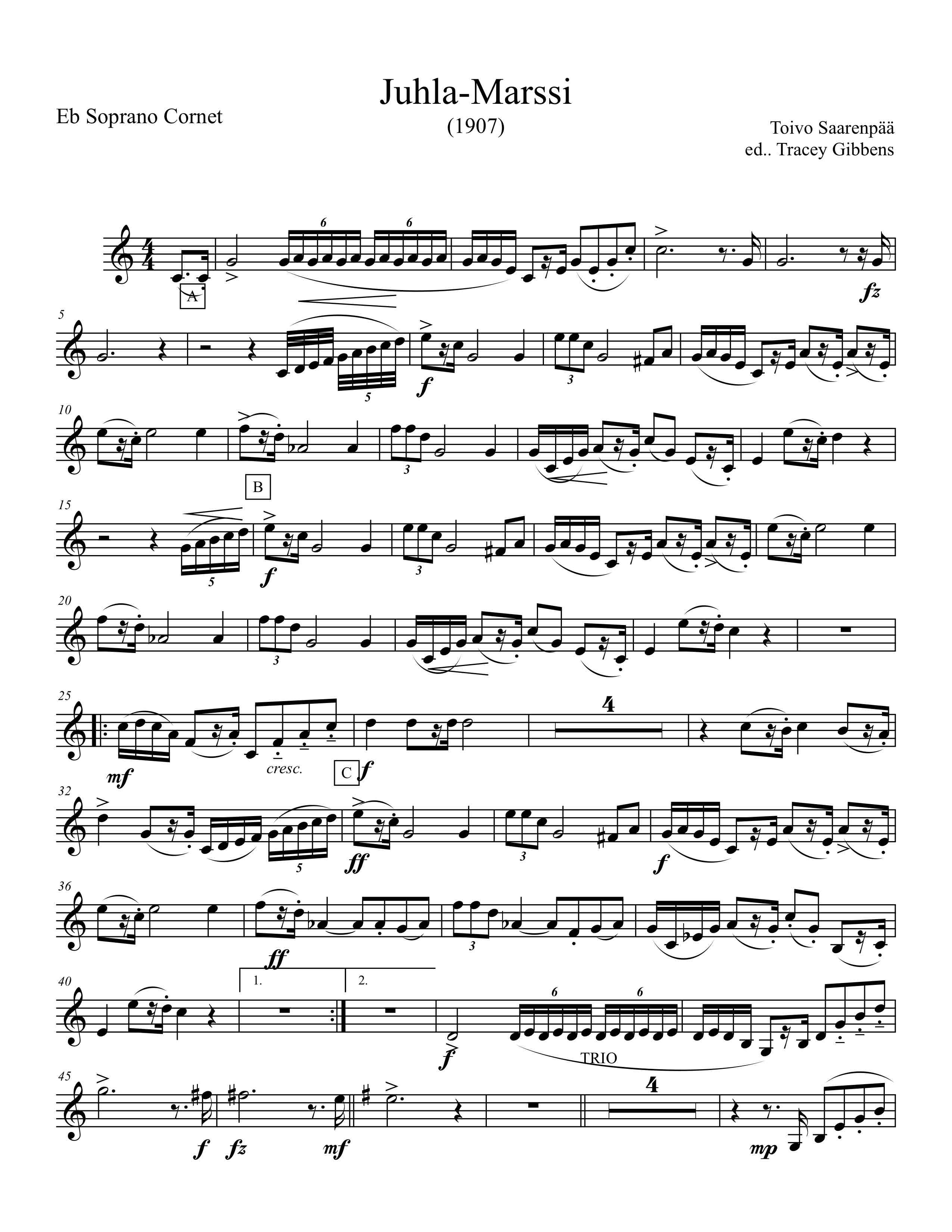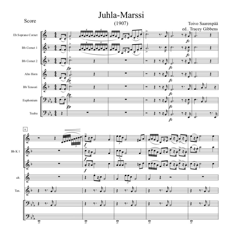 The Finnish Brass in America Series is scored primarily for original Finnish brass septet: E flat Soprano Cornet, two B flat Cornets, an E flat Alto Horn, a B flat Tenor Horn, and Euphonium, and a Tuba. However, these sets also include alternate parts for flute (piccolo), clarinet, French horn, and tenor saxophone. The original seven parts can also be played by other instrumentalists who read those clefs and transpositions (tenor saxophone, bassoon, bass clarinet, etc.) While many of us in Ameriikan poijat have contributed arrangements to this series, it has been primarily of work of Tracey Gibbens, with editing by Russell Pesola and Paul Niemisto.