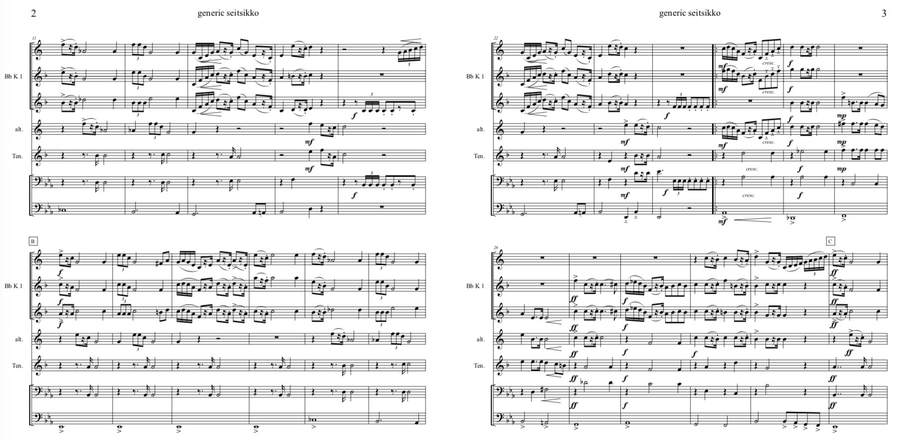 Standard Finnish septet : E-flat soprano cornet, B-flat cornet I, B-flat cornet II, E-flat alto, B-flat tenor , B-flat baritone, BB-tuba (concert pitch Bass Clef). Our wish is that brass players will try the conical brass instrumentation, but also welcome playing by mixed wind bands.