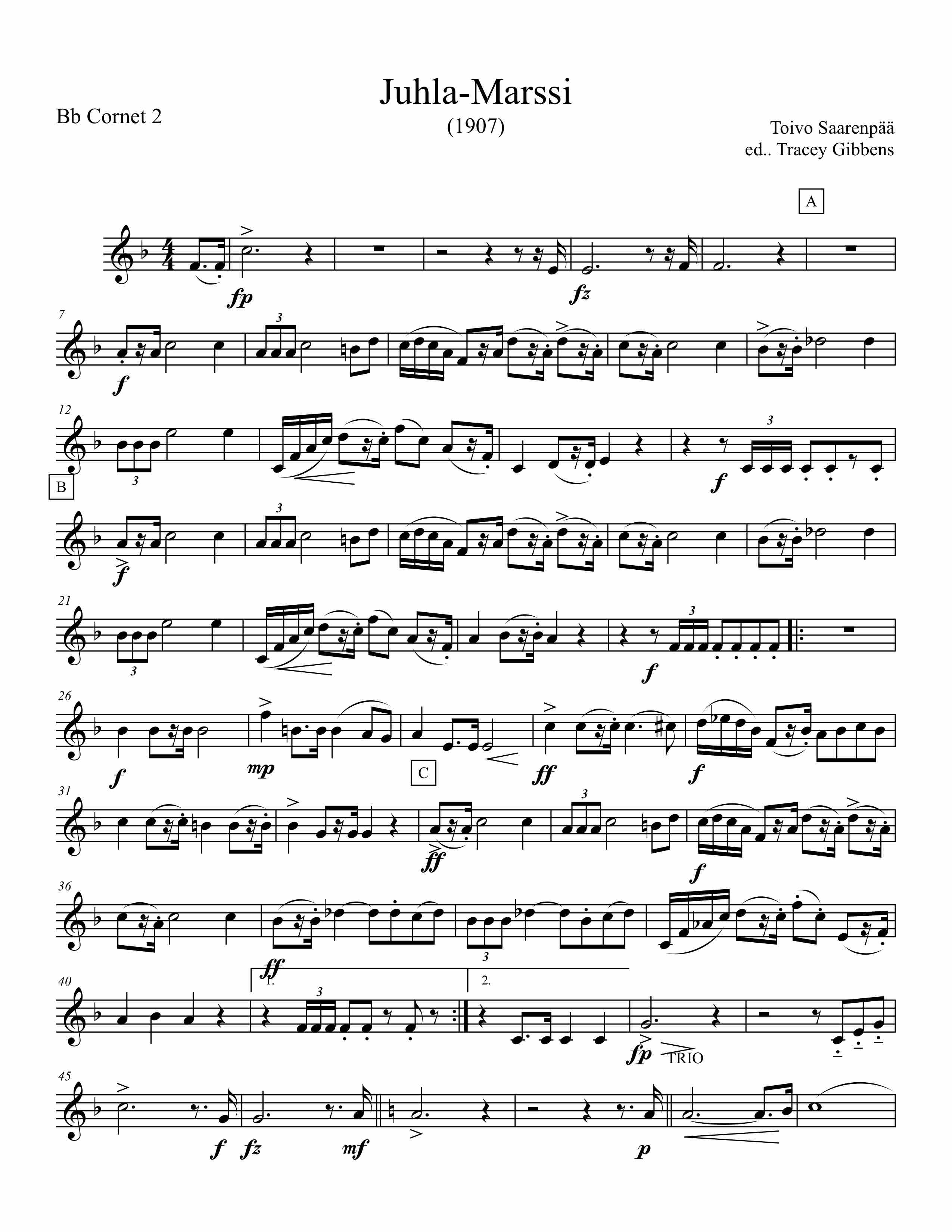 Juhlamarssi by Toivo Saarenpää (1907). Toivo Harras Saarenpää (April 6, 1882 Ruskeala - April 22, 1948 Tampere) was a Finnish composer, music teacher and orchestra and choir director. He used the surname Herckman until 1906, and changed as was the fashion of the time. He attended at the lyceum and later studied composition with Jean Sibelius and Ilmari Krohn at the Helsinki Philharmonic Orchestra in 1901– 1907, as well as playing the violin with his teacher Elis Jurva. He also made a trip to Germany in 1912 to complete his studies. He worked as a music professor in Vyborg (Viipuri) in many institutions.