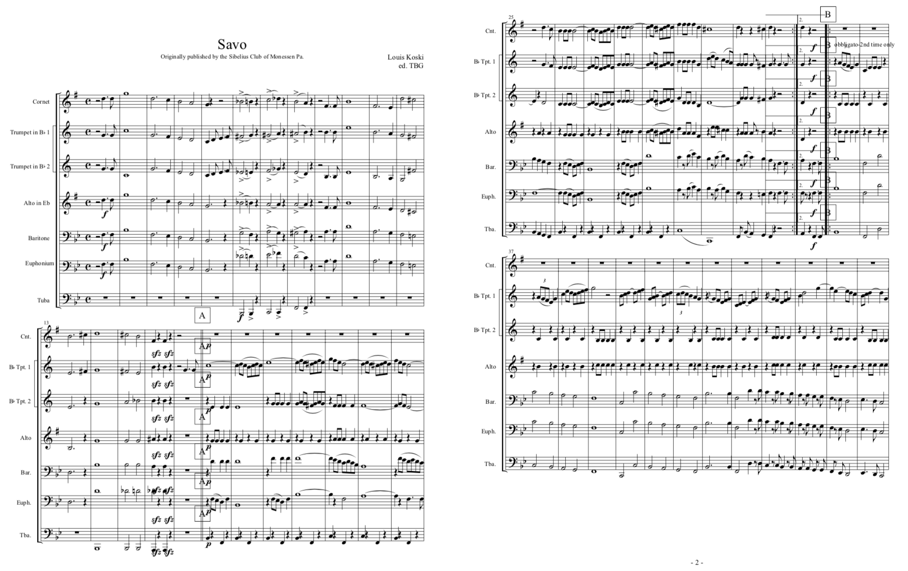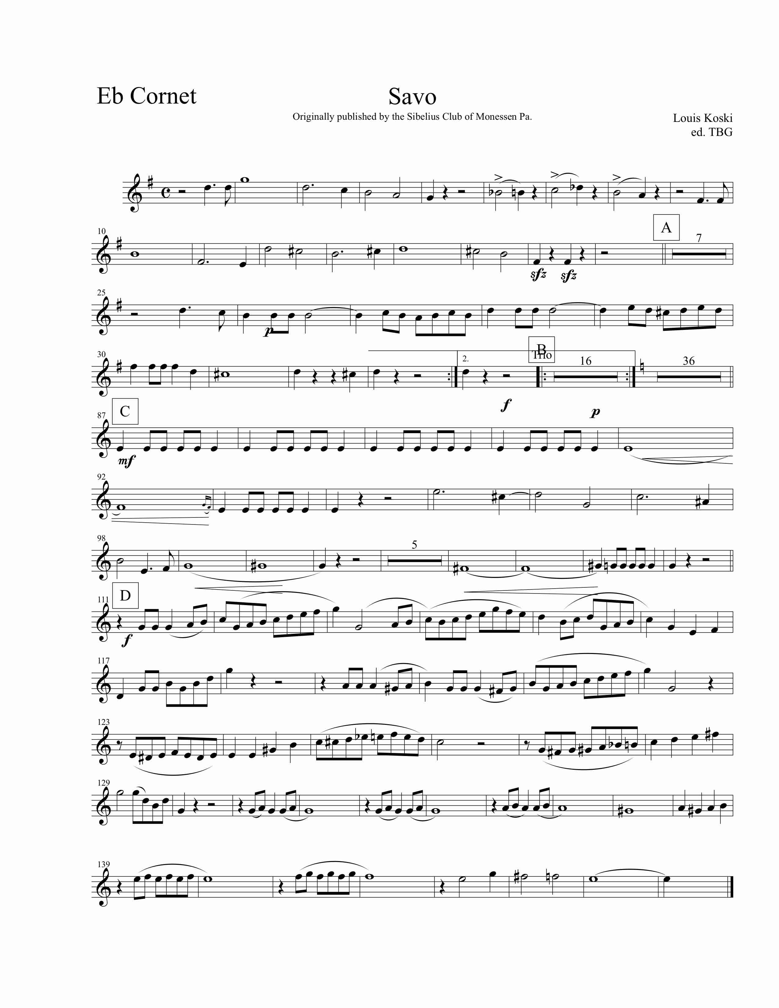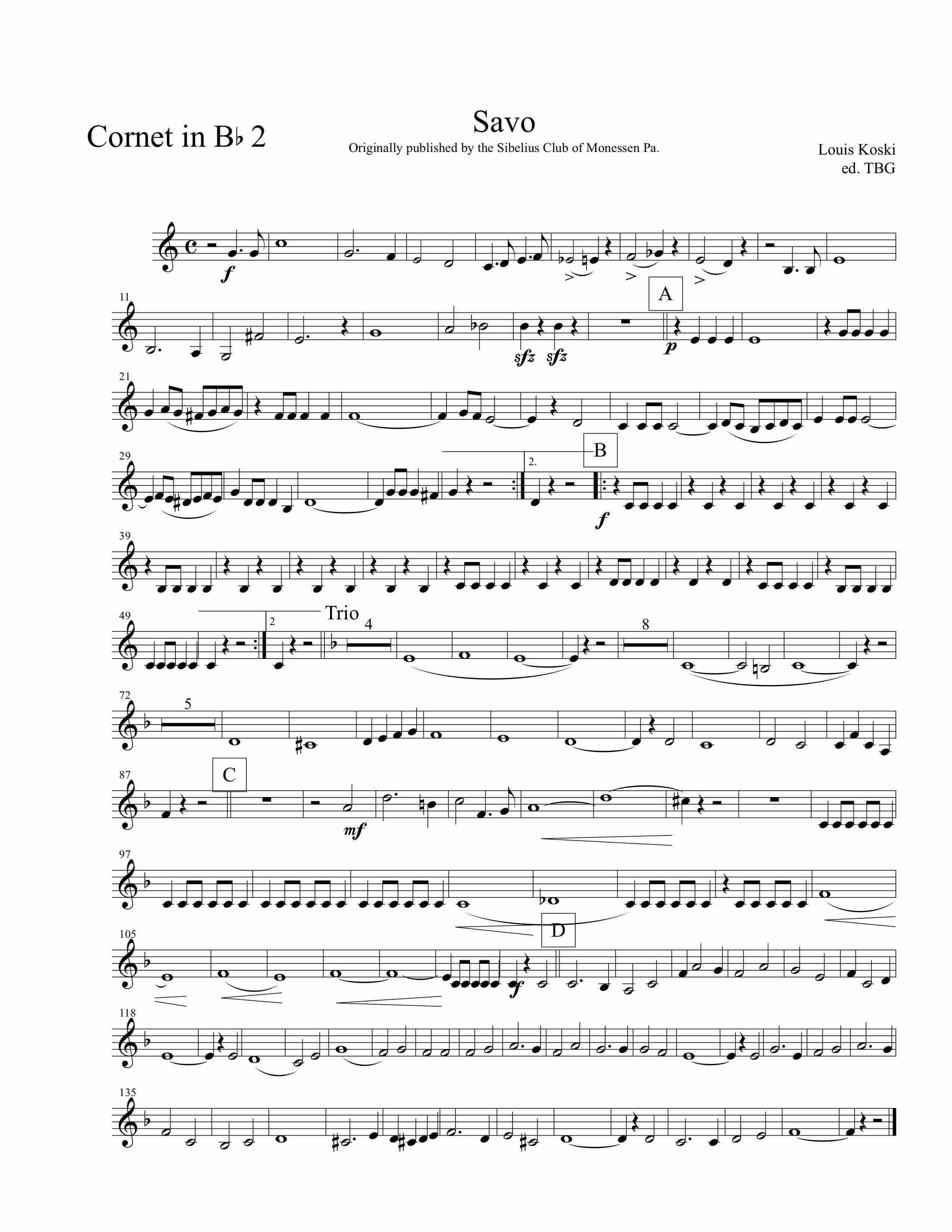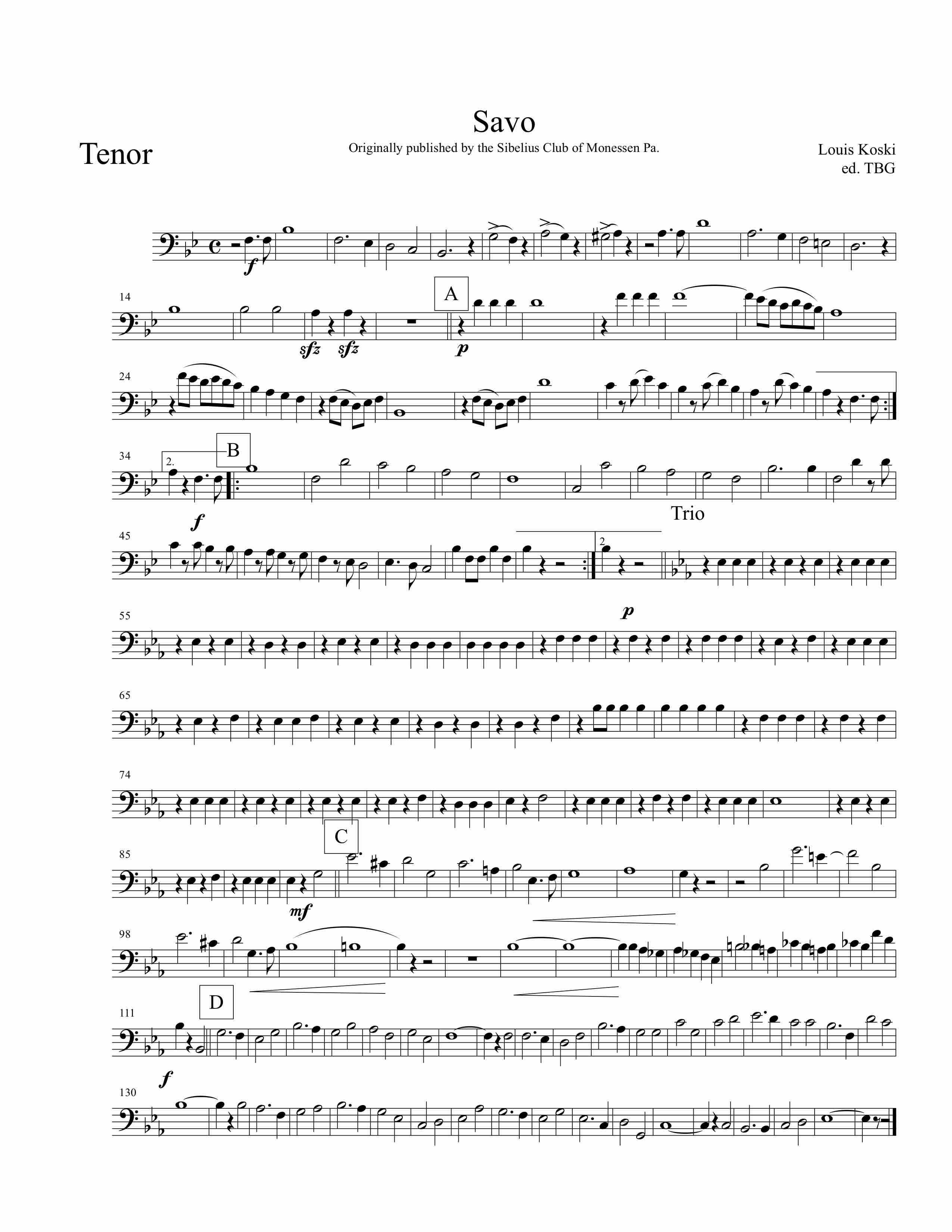 Savo March. Lauri (Louis) Koski was a very successful Finnish American bandmaster who was a key organizer of the Sibelius Seura (Sibelius Club) formed in Monessen, Pennsylvania in 1912. Sibelius Seura published a number of Finnish American compositions for band, including this Savo March. Records indicate “Savo” was favored by John Phillip Sousa, who programmed it with his famous band. Koski went on to conduct Finnish bands in Maynard, Massachusetts, which is where he is buried. A considerable collection of his works in manuscript has been found.