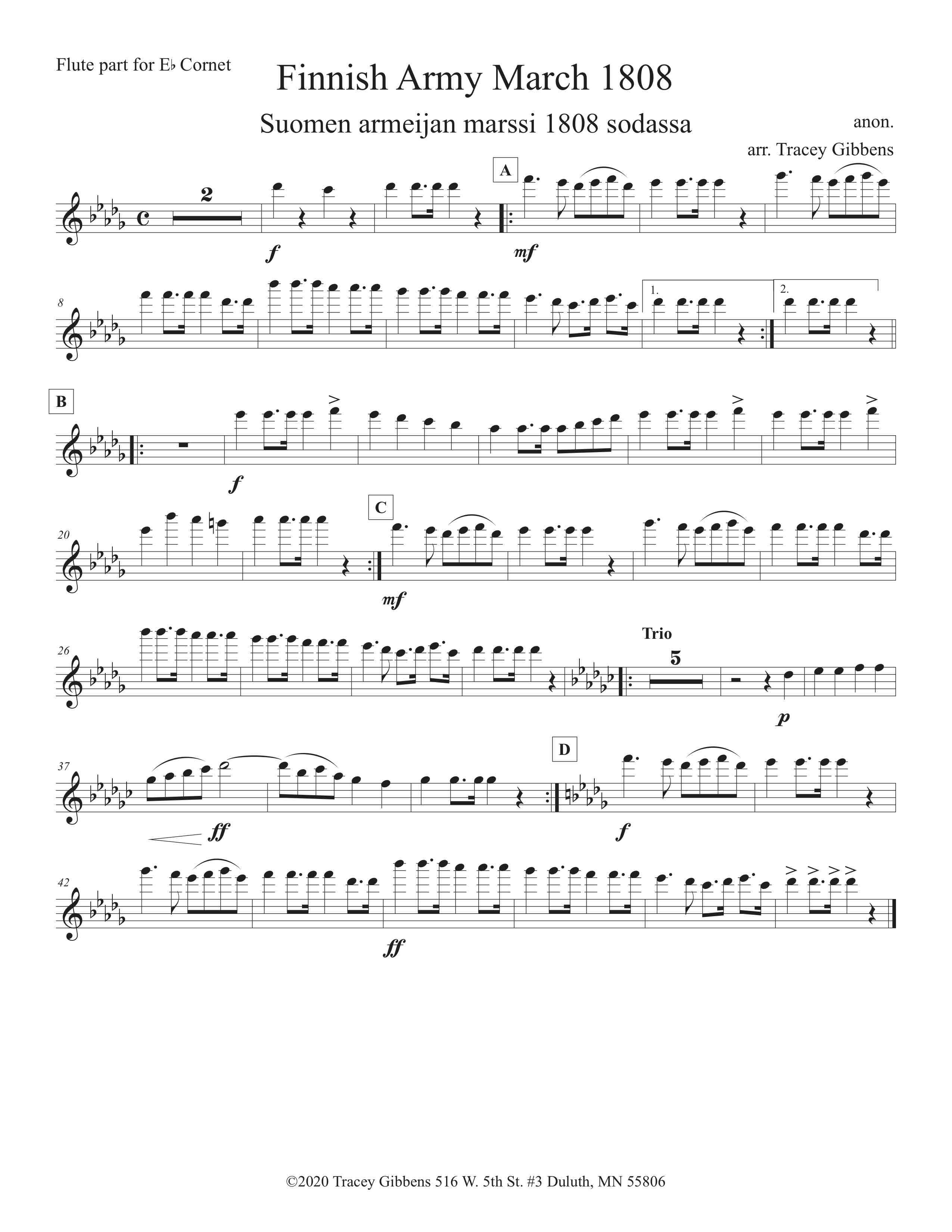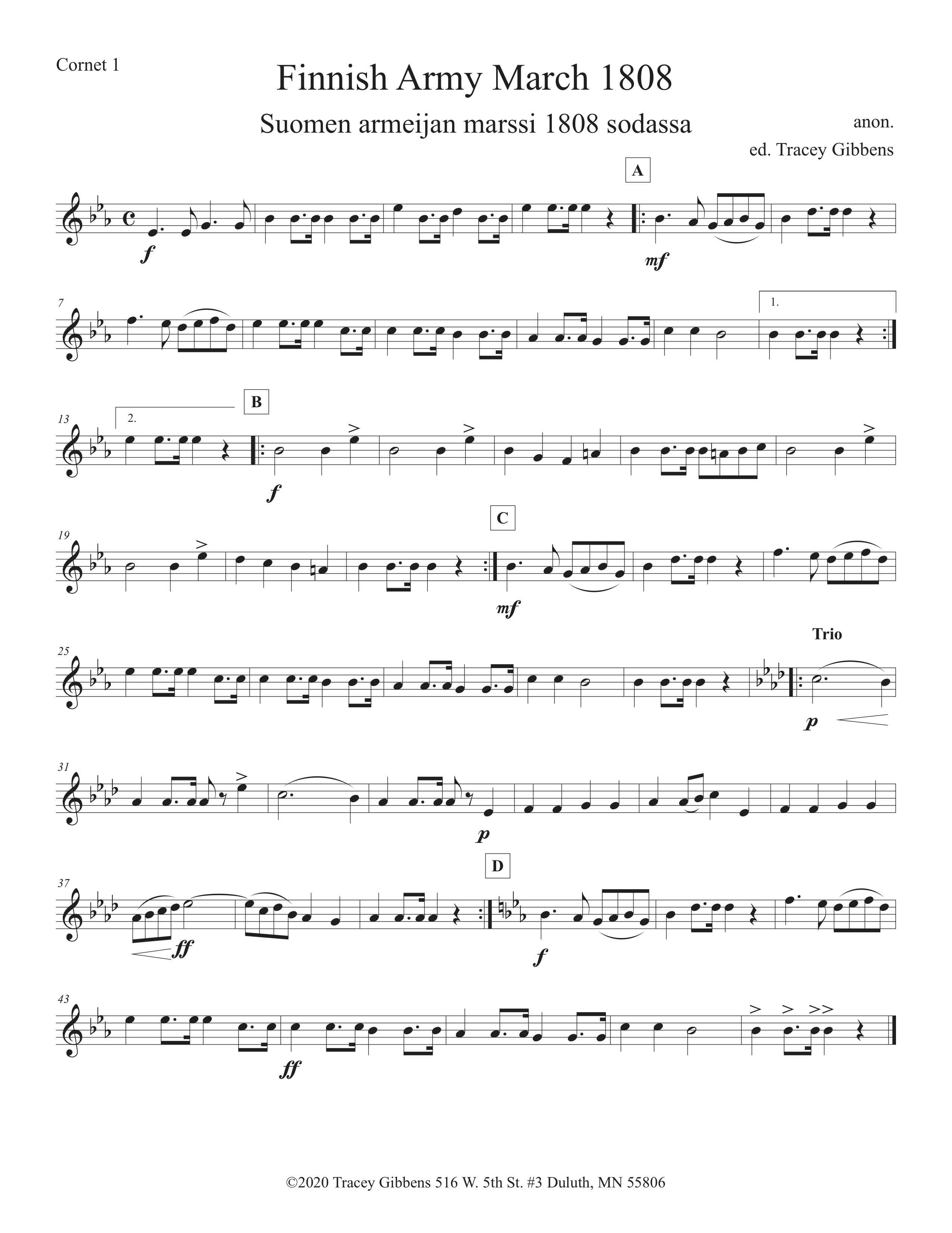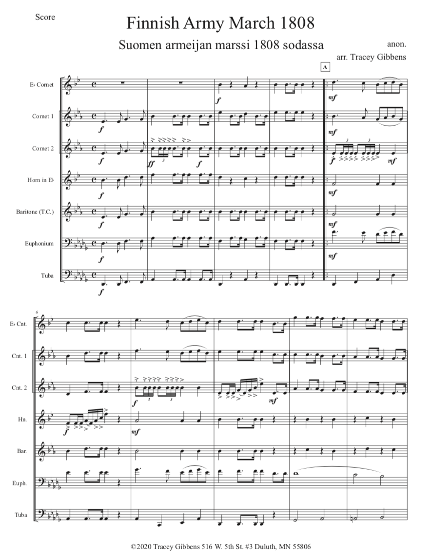 The Ameriikan poijat Finnish Classics Series is scored primarily for original Finnish brass septet: E flat Soprano Cornet, two B flat Cornets, an E flat Alto Horn, a B flat Tenor Horn, an Euphonium, and a Tuba. However, these sets also include alternate parts for flute (piccolo), clarinet, French horn, and tenor saxophone. The original seven parts can also be played by other instrumentalists who read those clefs and transpositions (tenor saxophone, bassoon, bass clarinet, etc.) While many of us in Ameriikan poijat have contributed arrangements to this series, it has been primarily of work of Tracey Gibbens, with editing by Russell Pesola and Paul Niemisto.