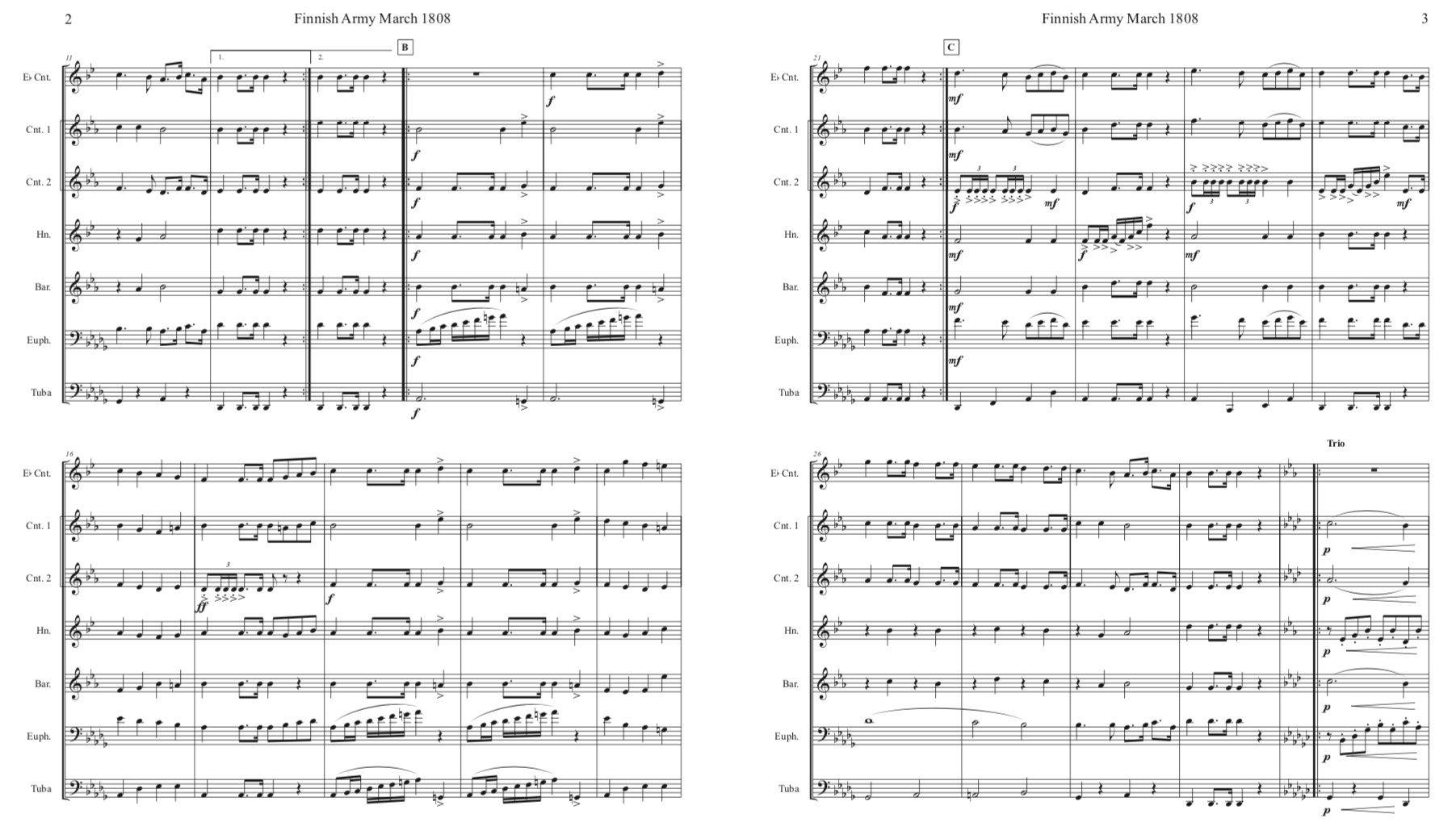 • Standard Finnish septet : E-flat soprano cornet, B-flat cornet I, B-flat cornet II, E-flat alto, B-flat tenor , B-flat baritone, BB-tuba (concert pitch Bass Clef). Our wish is that brass players will try the conical brass instrumentation, but also welcome playing by mixed wind bands.