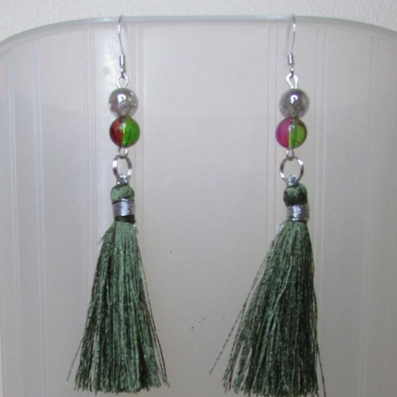 Korvakorut on koottu pitkänmallisesta lankatupsusta, tupsun värejä toistavasta helmestä ja hopeanhohtoisesta helmestä. Korvakorukoukut ovat hopean väriset eivätkä sisällä nikkeliä. Korvakorujen kokonaiskorkeus on noin 9 cm.