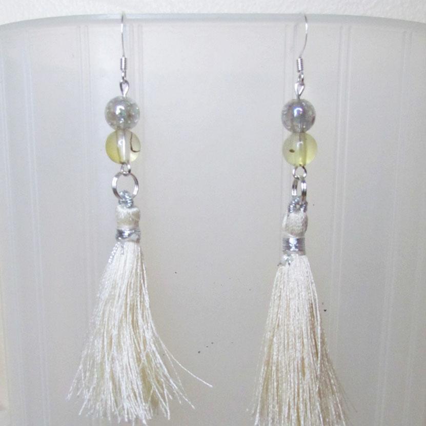 Korvakorut on koottu pitkänmallisesta lankatupsusta, tupsun värejä toistavasta helmestä ja hopeanhohtoisesta helmestä. Korvakorukoukut ovat hopean väriset eivätkä sisällä nikkeliä. Korvakorujen kokonaiskorkeus on noin 9 cm.