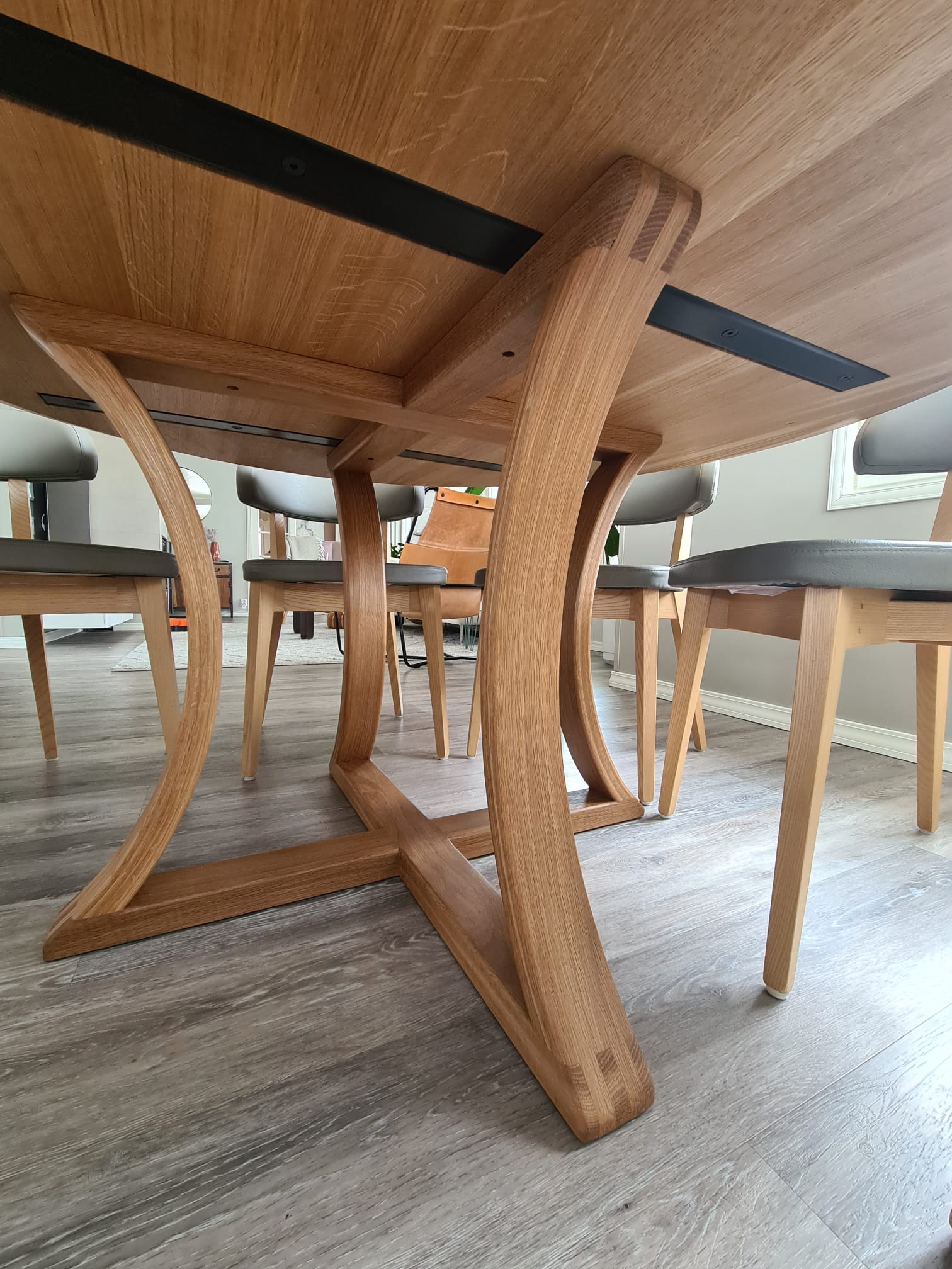 Suomalaista muotoilua kauneimmillaan. Tämä pöytä valmistetaan käsityönä jokaista asiakasta varten tilauksesta verstaallamme. Pöydän jalkojen kaaret valmistetaan laminoimalla 4 mm paksuja puuviiluja yhteen muottiin puristamalla. Kaarten ja jalkojen "ristien" välinen liitos on tehty sormiliitoksin. Pöydänkansi kiinnitetään jalkapakettiin ruuveilla, jotta pöydän kuljettaminen on helpompaa. Hinta on esimerkki tammesta valmistetusta 1500 mm halkaisijaltaan olevasta mallista. Ota yhteyttä, niin valmistetaan juuri sinulle sopiva pöytä! Pöydän kuljetuksesta sovitaan erikseen. Mieluiten asiakas noutaa pöydän itse, jotta voimme yhdessä katsoa tuotteen läpi ja todeta, että se on juuri sellainen kuin pitikin. Huom. Hinta ei sisällä postikuluja. Tuotteen noudosta sovitaan erikseen.