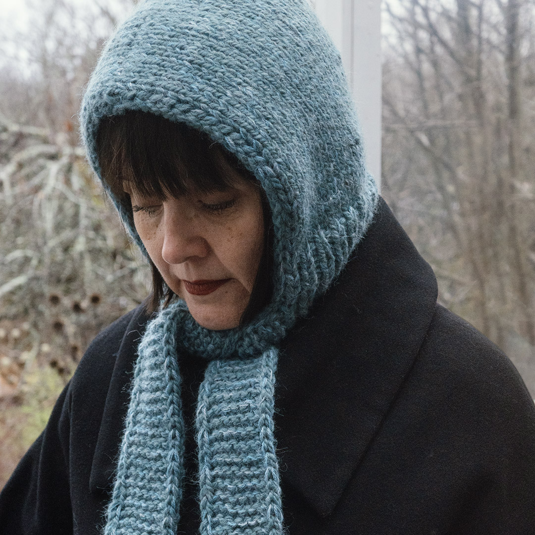 Tämä huppu on neulottu kolmella langalla yhtä aikaa ja on erittäin tiivis ja lämmin. Samalla ohjeella voit tehdä vähemmän tiiviin hupun käyttämällä vain ohjeen paksuinta lankaa yksinkertaisena samalla tiheydellä.
