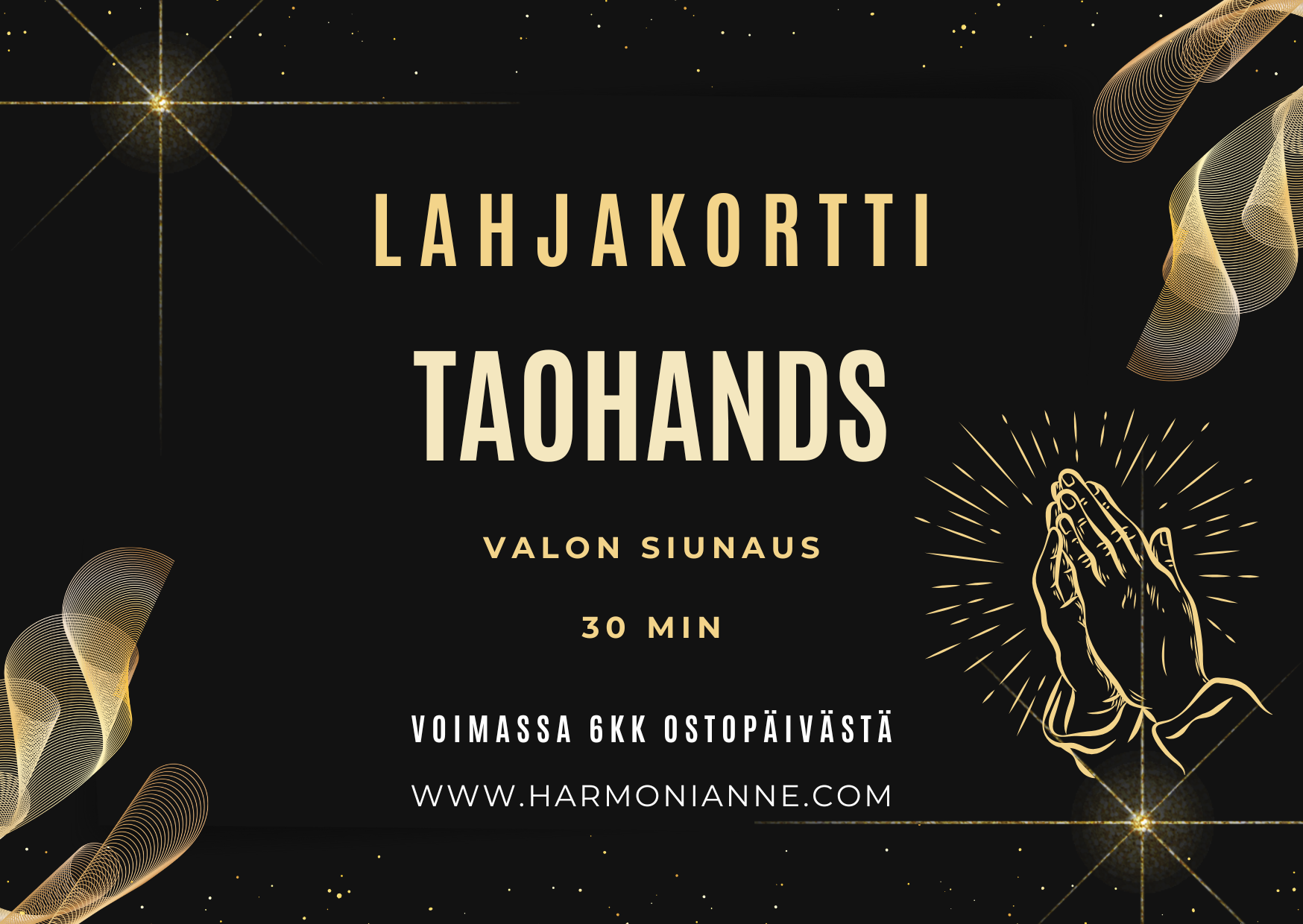 Tämä lahjakortti oikeuttaa lahjansaajan 30min TaoHands-etähoitoon. Ostettuasi lahjakortin, saat ladattavaksi pdf.tiedoston, jonka voit lähettää suoraan vastaanottajalle. Hän ottaa minuun yhteyttä sopiaksemme hoidon toteutustavan ja aikataulun.