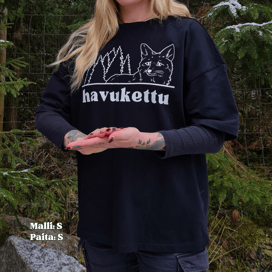 Unisex, ns painavan kankaan oversized t-paita on tehty 100% puuvillasta. Olkasaumat on tipautettu alemmas ja sopii hyvin arkikäyttöön. SNOW ja MOSS paitojen tuotot menee suoraan metsänsuojelurahastoon. Paidan edessä on Havuketun logo ja takana metsäkuvituksemme. Kaikki tämän kuvituksen tuotteiden tulot menee metsäsuojelurahastoomme.