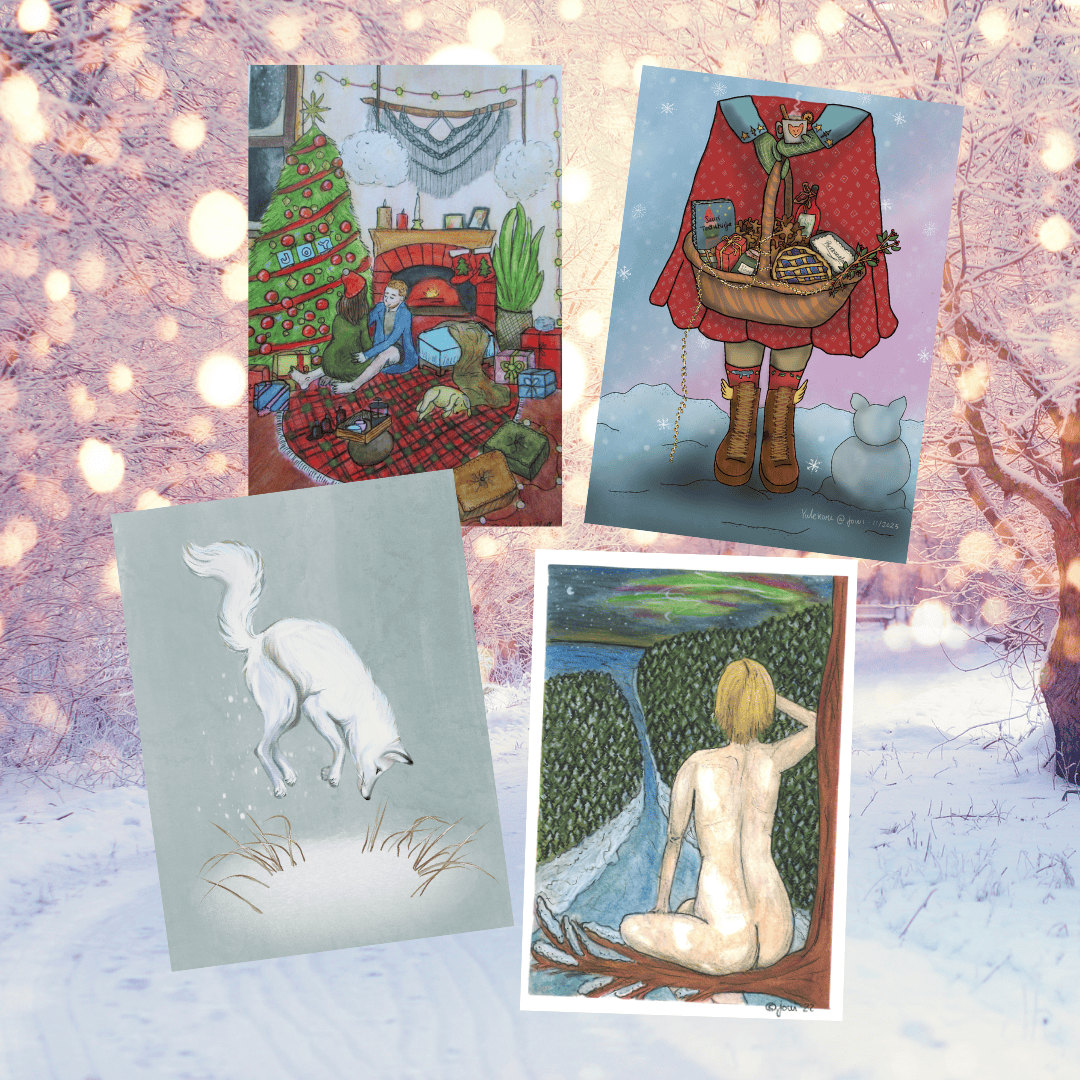 Kuvitus: -Havukettu ry:n Kekrikoria seurasi Talveen sopiva Yulekori. Se on koottu kunnioittamaan tätä vuodenajan perinnettä eläin- ja luontoystävällisestä näkökulmasta. Se juhlistaa myötätuntoa, yhteyttä ja kestävää elämää – ilman eläinten hyväksikäyttöä. Hahmolla on kädessä Kuuma glögimuki, korista löytyy jouluisia ruokia kuten piirakkaa, porkkanalaatikkoa ja pipareita. Talven kirjana on Suuri Tonttukirja. Suuri tonttukirja on Wil Huygenin kirjoittama ja Rien Poortvlietin kuvittama viihteellinen kirja, joka kertoo tonttujen kuvitellusta arkielämästä ja opettaa kunnioittamaan luontoa. Kirjan on suomentanut Panu Pekkanen. Jaloissa on alkeellinen kettulumiukko ja koria koristaa jouluvalot. -Jowisfreelifen joulukortti "Minnesota" missä yhdistyy klassisen joulun elementtejä, kultaisennoutajan koiranpennusta > koristeltuun joulupuuhun. -Vuodenaikojen naiset - korttisarjan "Talvi". Näissä korttisarjoissa yhdistyy moni eri tekijä: vuodenaika ja siihen liittyvä päivänaika ja elementti. Talvessa esiintyy yö ja maa. Toteutettu käsityönä (Vesiväri A5 + Micron). Kevät – Ilma ja tuuli: alkava kasvu, luovuus, aamu Kesä – Tuli: elo, täyteys, aurinko, keskipäivä Syksy – Vesi: kypsyys, sadonkorjuu, ilta Talvi – Maa: lepo, yöt, puoliyö. Jokaisena vuodenaikana tulee eri tuotteet myyntiin. Talven myyntiaika on joulukuusta - helmikuun loppuun. Jos sinua kiinnostaa printistä isompi juliste tauluksi, otathan yhteyttä! havukettury@gmail.com Nämä kolme työtä on tehnyt Jowi, löydät kirjailijan & kuvittajan profiilin instagamista: @jowiwrites / @jowibarina / @jowisfreelife. Neljännen talven kortin meille on tehnyt taitava artisti. Ilahduttava ja leikkisä naalin hyppy kortti! Tämän taidetyön on tehnyt ja meille lahjoittanut Orivesiläinen pienyritys Frog Pond. Heillä tehdään tatuointeja, pigmentointeja, tuftauksia ja muita taidetöitä. Pääset heidän kotisivuille tästä: www.frogpond.fi & Instagramissa: Frog__Pond