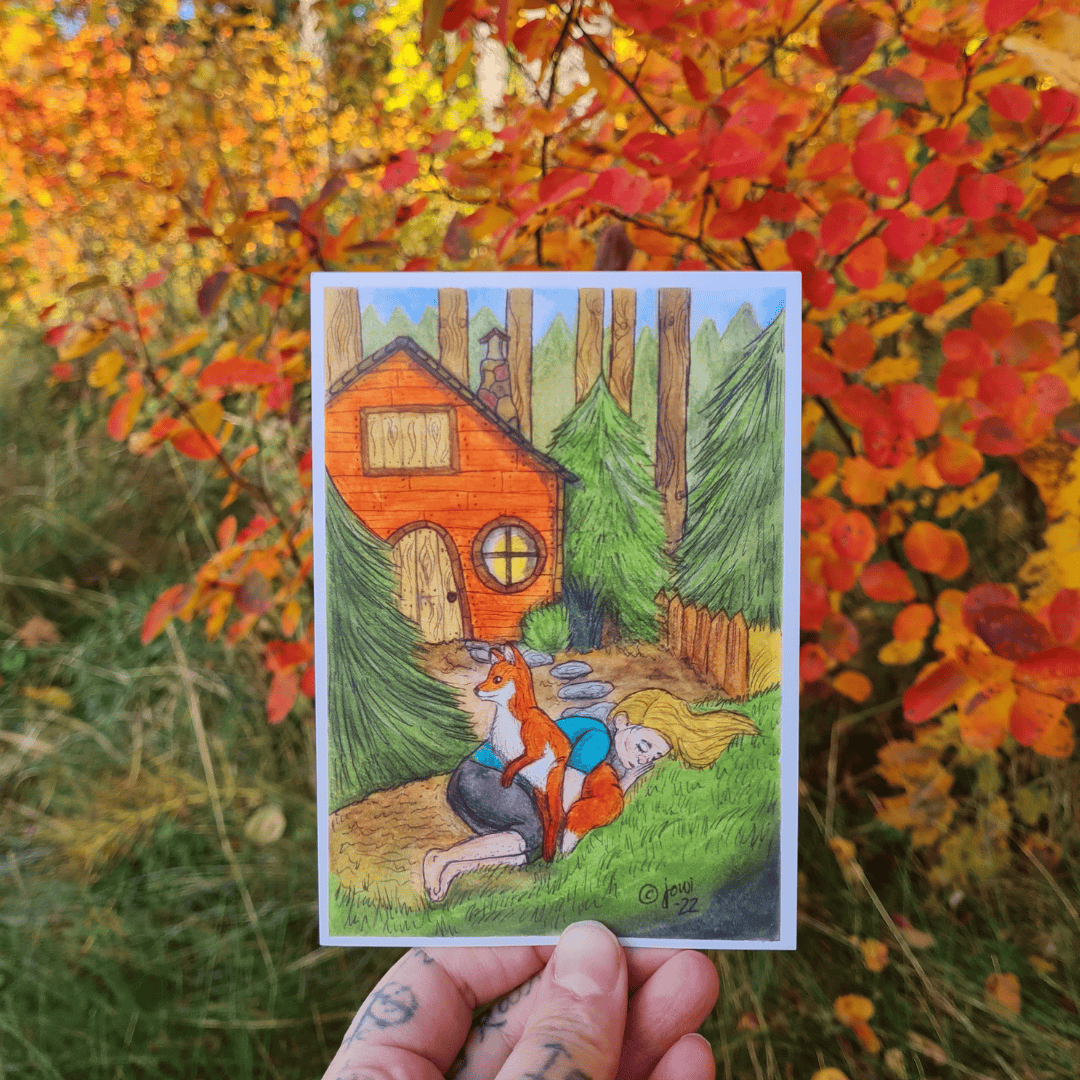 Varjoista - runokirjan kuvituksista tuttu "Kettu sylissä" postikortti on saapunut syksyn valikoimaan. Tässä idyllissä mielikuvassa tyttö ja kettu ovat nukahtaneet metsäiselle tontille. Kettu pitää vahtia ja suojelee.