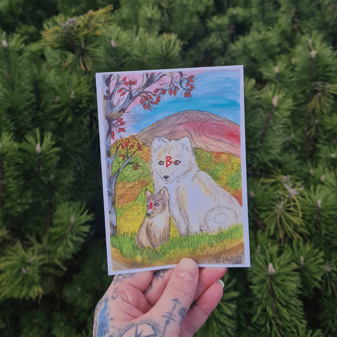 Tämä inspiroi ikuisena kettujen rakastajana tämän Naalit- postikortin. Naaleilla on otsassa punainen Berkano-riimu. Riimu kuvastaa mm. koivua ja hedelmällisyyttä. Se tarjoaa sylin unohdetuille, hoivan tarvitseville, kasvaa ja kasvattaa. Jos sinua kiinnostaa printistä isompi juliste tauluksi, otathan yhteyttä! havukettury@gmail.com Työn on tehnyt Jowi, löydät kirjailijan & kuvittajan profiilin instagamista: @jowiwrites
