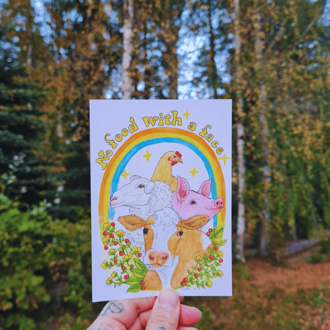 Eläinoikeuskortit on osa vakituista valikoimaamme, ja ne on tullut lahjoituksena @jowisfreelife käsityöyritykseltä. Sarjaan kuuluu neljä erilaista eläintenoikeuksista puhuvaa postikorttia. "No food with a face" on lihateollisuutta vastustava kortti. "Itselleni näin eläintenhoitajana on aina eläimet olleet lähellä sydäntä. Eläimet ovat viisaita, persoonallisia ja upeita viattomia otuksia jotka ovat osa yhteiskuntaamme ja luontoamme. Olemme samanvertaisia keskenämme, vaikka ihmisten tapa elää tällä yhteisellä pallolla onkin ollut enemmän tuhoava ja dominoiva - kuin harmoninen. Mutta onneksi voimme myös muuttaa asioita sen sijaan että vain toimimme sokeasti samalla tavalla kuin joskus vuosien alussa. Voit lukea lisää jokaisesta kortista täältä: jowisfreelife.blogspot.com/2020/11/elainoikeus-postikortit.html ".