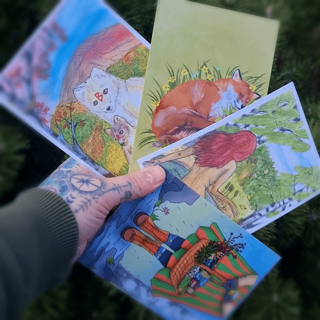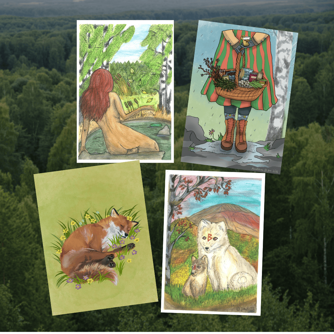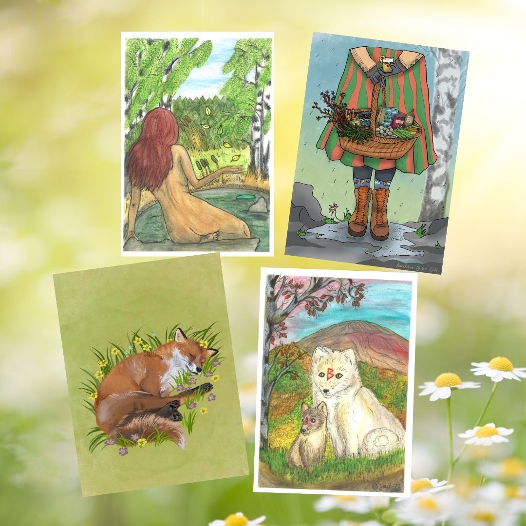 Toteutettu käsityönä (Vesiväri A5 + Micron). Kevät – Ilma ja tuuli: alkava kasvu, luovuus, aamu Kesä – Tuli: elo, täyteys, aurinko, keskipäivä Syksy – Vesi: kypsyys, sadonkorjuu, ilta Talvi – Maa: lepo, yöt, puoliyö. Jokaisena vuodenaikana tulee eri tuotteet myyntiin. Kevään myyntiaika on maaliskuusta - toukokuun loppuun. Jos sinua kiinnostaa printeistä isompi juliste tauluksi, otathan yhteyttä! havukettury@gmail.com Nämä kolme työtä on tehnyt Jowi, löydät kirjailijan & kuvittajan profiilin instagamista: @jowiwrites / @jowibarina / @jowisfreelife. Neljännen talven kortin meille on tehnyt ja meille lahjoittanut Orivesiläinen pienyritys Frog Pond. Heillä tehdään tatuointeja, pigmentointeja, tuftauksia ja muita taidetöitä. Pääset tutustumaan heihin instagramissa: Frog__Pond