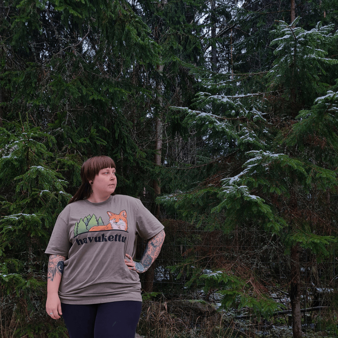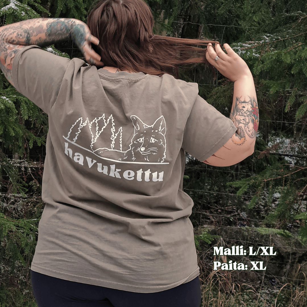 Havuketun tuplalogo paita, edessä logo väreillä ja takana mustavalkoinen. Kolme eri väri vaihtoehtoa (Mineraali, hiekka, dyyni), tuotettu Espanjassa.