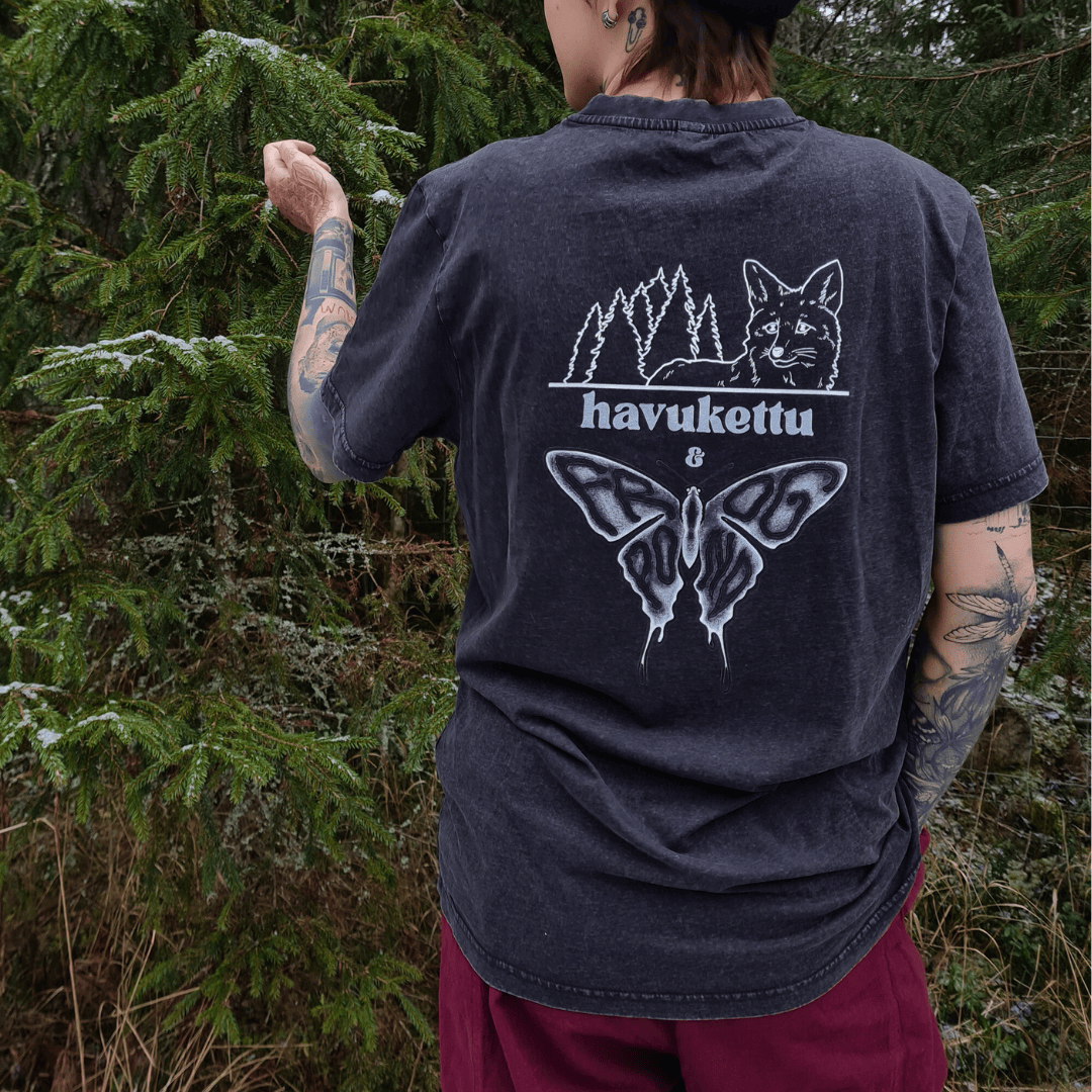 Frog Pond taideyrityksen lahjoittama kuvitus Havuketulle nyt myös saatavilla paidan muodossa! Ihana "Kettu kerällä" postikortista tuttu ja rakastettu kuvitus myös paidan muodossa. Acidwashed/Stonewashed kivipesty lookki unisex paidassa. Tässä tyköistuvampi ja pidempi malli kuin meidän AHS paidoissa. 100% puuvillaa, kylmäpesu 30c