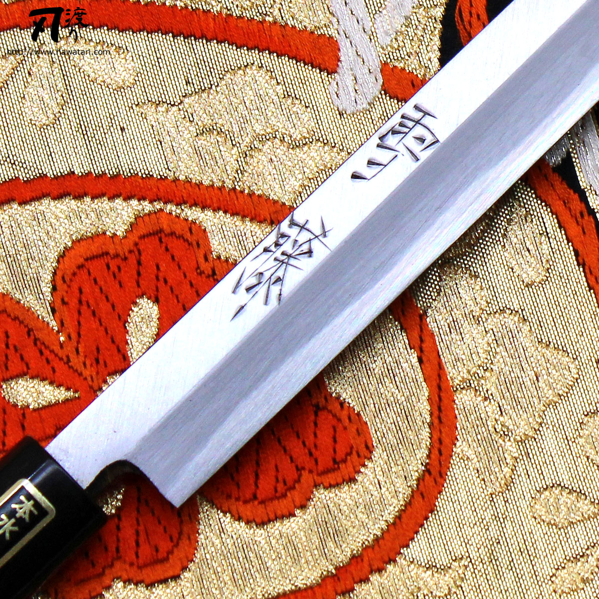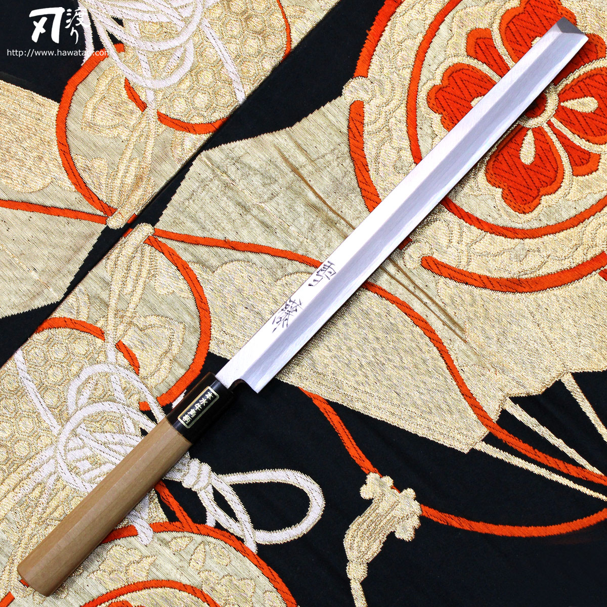 Takobiki is a traditional Japanese sashimi slicer from Kanto area (Eastern Japan). Japanese word “takobiki” (蛸引) can be translated as “octopus cutter”. Takobiki is used for slicing boneless fish meat for sashimi. It can also be very efficiently used for skinning fish fillets. DO NOT USE YOUR SASHIMI KNIVES ON MEAT THAT HAS BONES IN IT! Cutting bones can seriously damage the delicate edge of your knife!