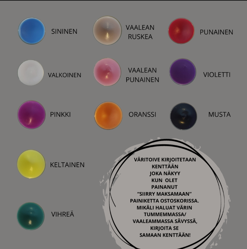 Tämän kynttilän värit voit itse valita Kun siirryt maksamaan tilausta, sinulta kysytään väritoive. Jos haluat värin tummemmassa tai vaaleamassa sävyssä kirjoita se myös!
