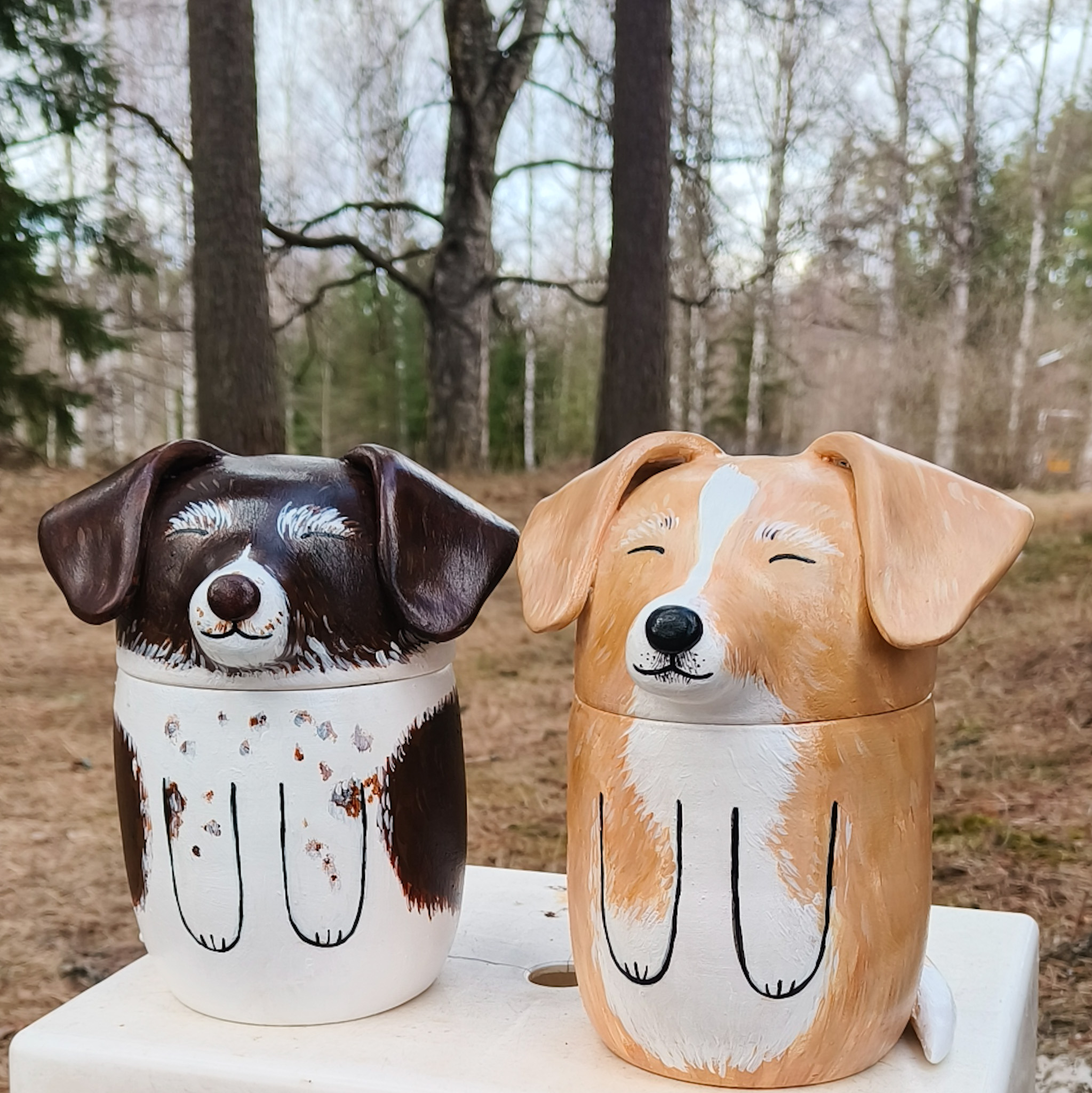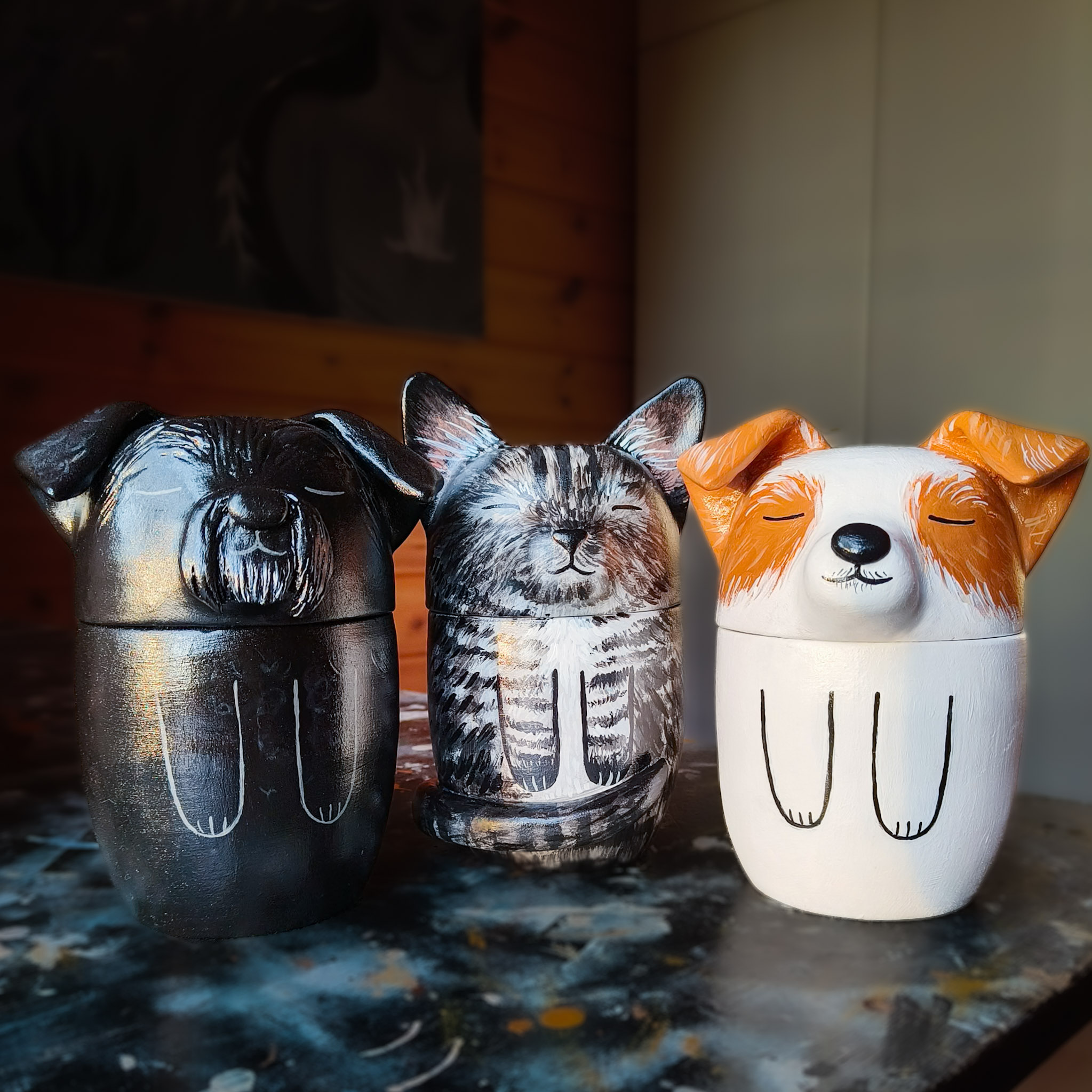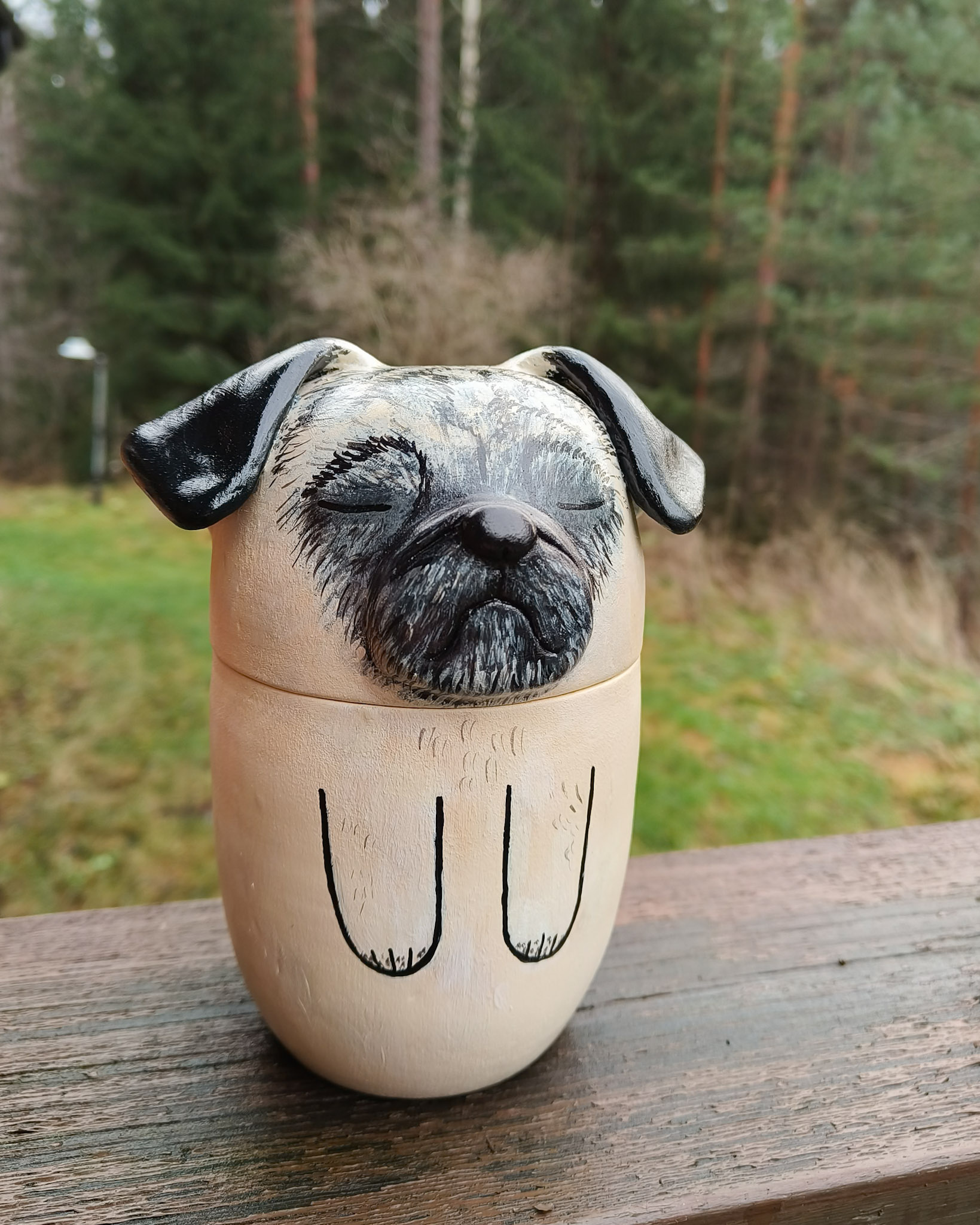Jokaisen uurnakoon voi myös muokata muistopatsaaksi, eli silloin teoksessa ei ole avautuvaa kantta. Hinta on sama kuin sen kokoisella uurnalla. Kun koko on selvillä, voit lähettää minulle kuvia lemmikistäsi ja aloitan tilauksen valmistamisen. Lähetän sinulle kuvia kommentoitavaksi sekä muotoilu-, että maalausvaiheessa, jotta työstä tulee varmasti mieleinen. Uurna on keraaminen, ja se maalataan akryyliväreillä ja pinta käsitellään lakalla. Tätä uurnaa ei ole tarkoitettu haudattavaksi, vaan koriste-esineeksi ja tuhkan säilytykseen.