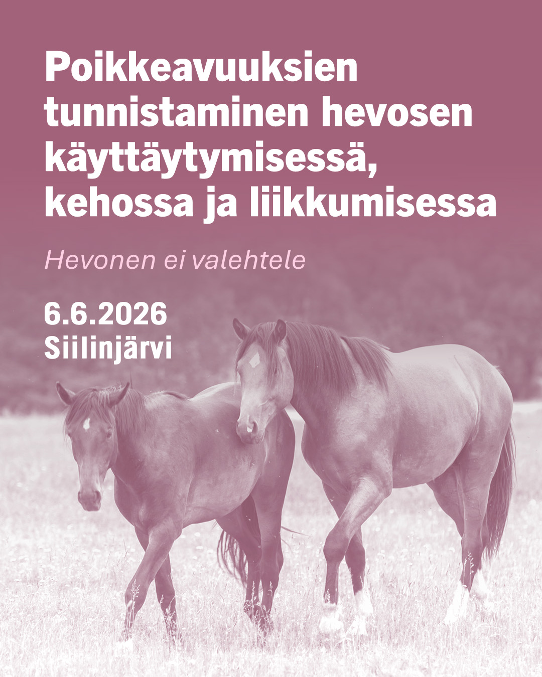 Kurssi on tarkoitettu hevosenomistajille ja hevosten parissa toimiville jotka haluavat rauhallisessa, turvallisessa ja avoimessa ilmapiirissä oppia tunnistamaan hevosen kivun merkkejä ja vahvistaa luottamusta omiin havaintoihinsa.