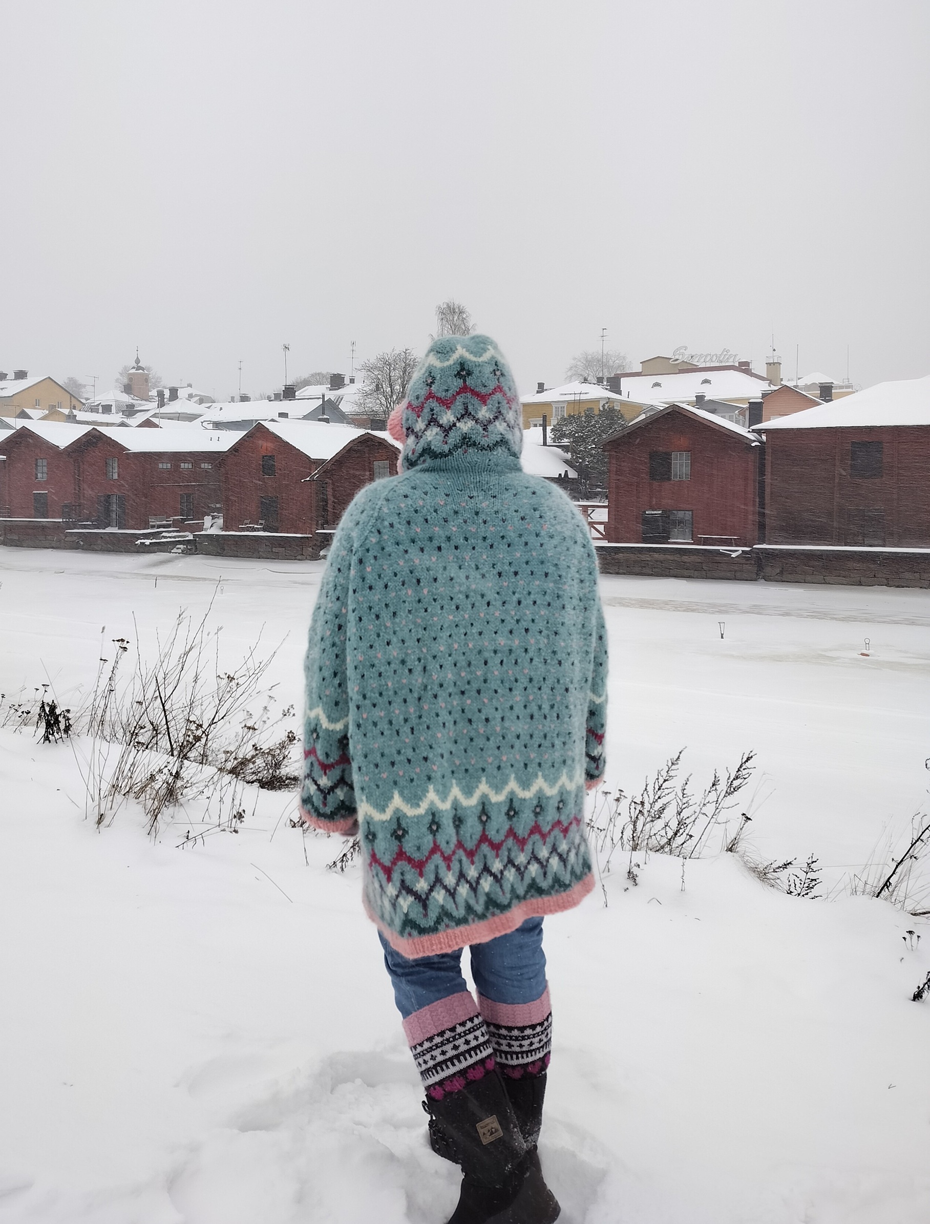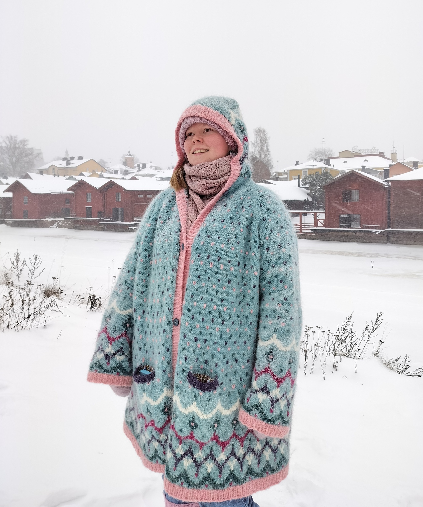 Ohje kirjoneuletakkiin islantilaisesta villasta. Takin pinta on kokonaan kirjoneuletta: helmaa, hihoja ja huppua koristavat isot kuviot, hartiaseutua pilkut. Pohjavärin lisäksi työhön tarvitaan 5 kuvioväriä. Takissa on raglan-olkapäät, huppu sekä taskut.