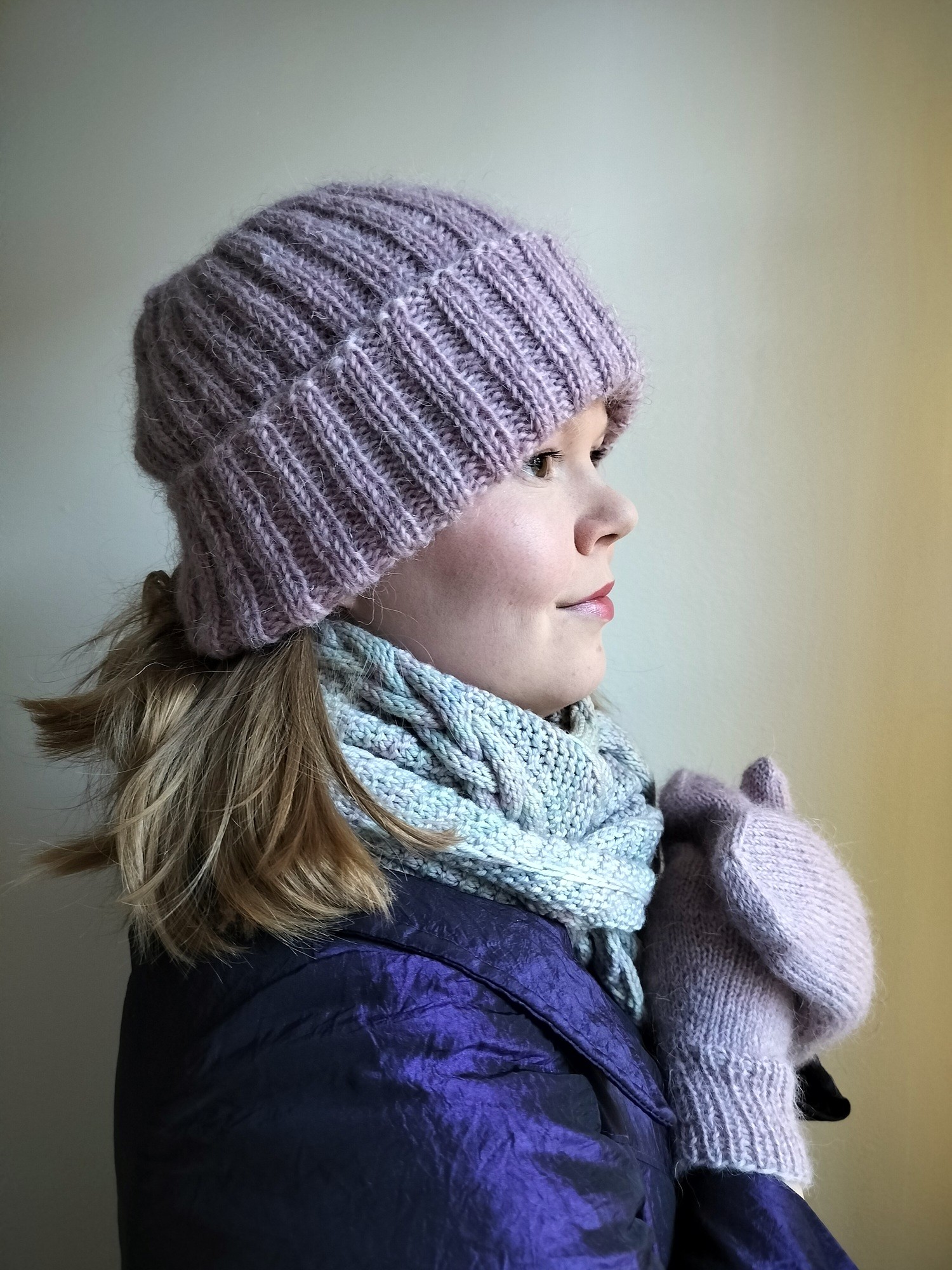 Pehmeät ja lämpöiset tumput ja pipo suomalaisesta, käsinvärjätystä ahvenanmaanlampaan villasta. Pipo on ribbineuletta ja tumput sileät. Lanka on hieman pörröistä.