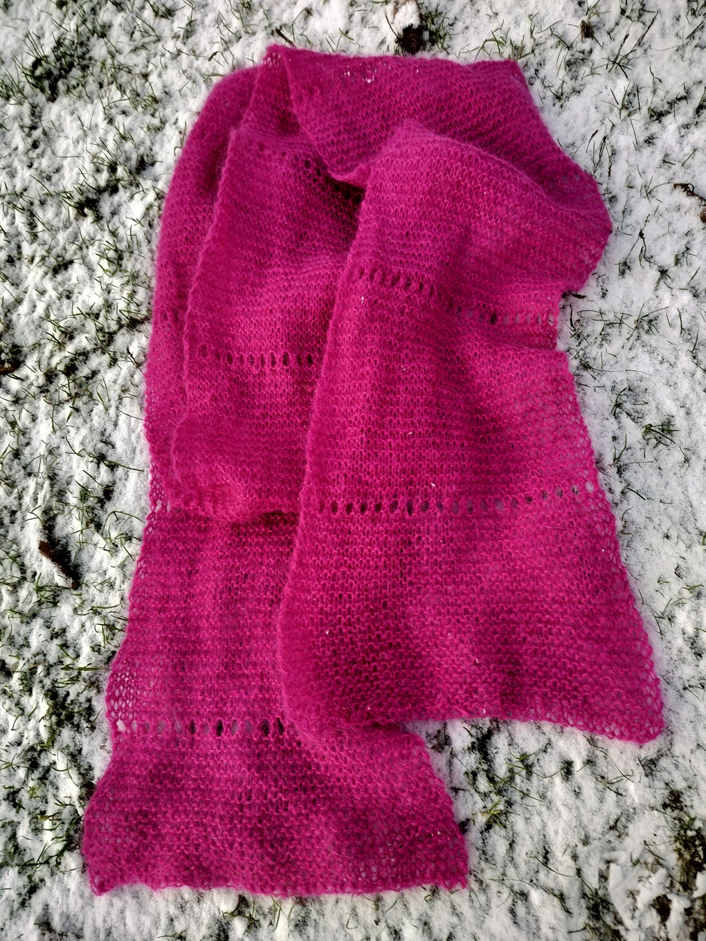 Ohje helppoon huiviin, joka sopii myös aloittelijoille. Pinta on ainaoikeinneuletta ja sitä koristavat sievät, mutta helpot pitsiraidat. Huiviin sopii mikä tahansa lanka, joka tuntuu mukavalta kaulaa vasten. Mallikuvien pinkki huivi on Novitan Tuulia, jota tarvitaan 100 g. Paksumpia villalankoja kannattaa varata 300-400 g riippuen siitä, kuinka pitkän huivista haluaa.
