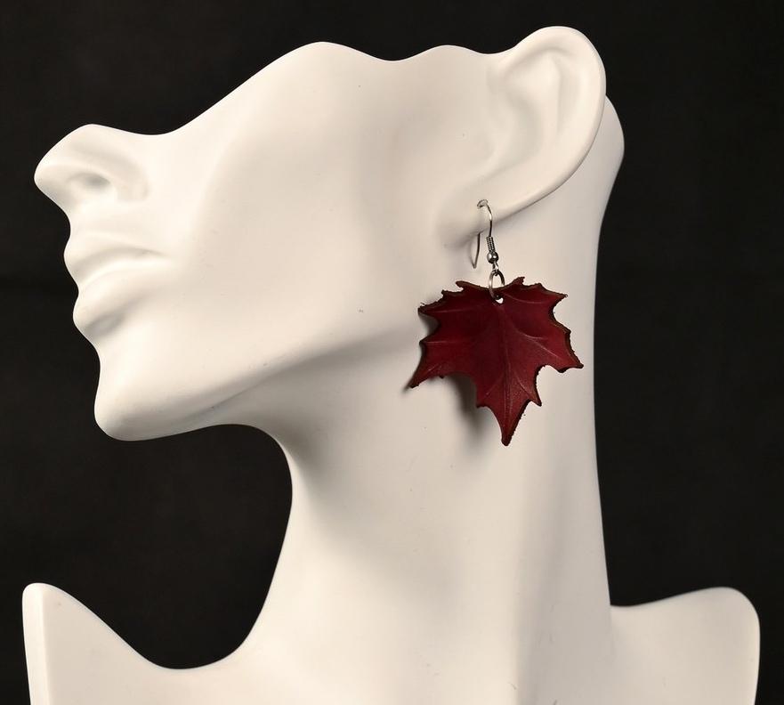 Kasviparkitusta nahasta käsin muotoillut vaahteranlehtikorvikset. Muoto on saanut inspiraationsa aidosta vaahteranlehdestä ja väreissä hehkuu ruska. Hyvin kevyet, lehden korkeus n. 3,5cm, kokonaiskorkeus koukun kanssa n. 5cm Metalliosat allergisoimatonta kirurginterästä.