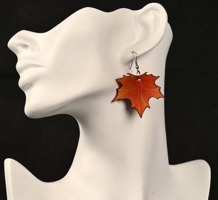 Kasviparkitusta nahasta käsin muotoillut vaahteranlehtikorvikset. Muoto on saanut inspiraationsa aidosta vaahteranlehdestä ja väreissä hehkuu ruska. Hyvin kevyet, lehden korkeus n. 3,5cm, kokonaiskorkeus koukun kanssa n. 5cm Metalliosat allergisoimatonta kirurginterästä.