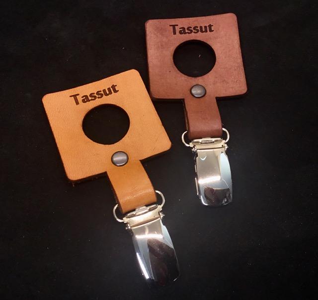 Materiaali on napakkaa kasviparkittua naudannahkaa, käsin värjätty. Lev 4,5cm, nahkaosan korkeus 6cm Reiän halkaisija 2cm Kokonaiskorkeus klipsin kanssa 9,5cm