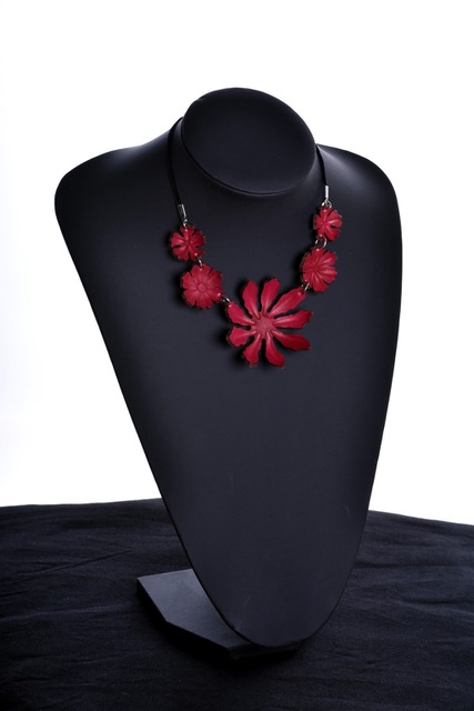 Nahkainen kaulakääty on käsin muotoiltu ja hyvin kevyt. Materiaali on värjäämätöntä kasviparkittua nahkaa. Osat muotoillaan yksitellen käsin ja värit sekoitetaan pigmenteistä joka maalauskerta erikseen, jokainen koru on siis ainutlaatuinen. Kaikki metalliosat ovat nikkelittömiä. Säädettävä nauha on iholla miellyttävältä tuntuvaa samettia. Suurimman kukan halkaisija on n. 70mm.  Voit käyttää korua monella eri tavalla; pukea sen juuri oikealle korkeudelle kaulaasi, kiepauttaa pannaksi hiuksiin tai otsalle, ranteessa, nilkassa... Keveytensä ansiosta House of Simone nahkakorua voivat käyttää myös useimmat tuntoyliherkät henkilöt.