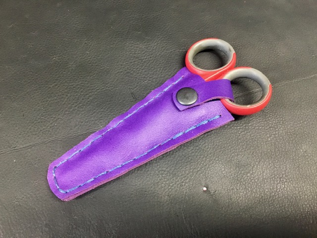 Pienten saksien kotelo, violetti-sininen. Sopii maksimissaan 9cm saksille. Käsin leikattu ja ommeltu aidosta nahasta, nepparikiinnitys. Saksikotelojen nahka on pajani ylijäämäpalaa koru- ja asustetuotannosta, vuodan reunaa tai muuta vaikeasti käytettävää, mutta materiaalina priimaa ja arvokasta. Valmistettu käsityönä Kangasalla.