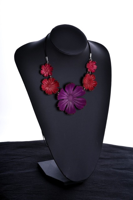 Nahkainen kaulakääty on käsin muotoiltu ja hyvin kevyt. Materiaali on värjäämätöntä kasviparkittua nahkaa. Osat muotoillaan yksitellen käsin ja värit sekoitetaan pigmenteistä joka maalauskerta erikseen, jokainen koru on siis ainutlaatuinen. Kaikki metalliosat ovat nikkelittömiä. Säädettävä nauha on iholla miellyttävältä tuntuvaa samettia. Suurimman kukan halkaisija on n. 75mm. Voit käyttää korua monella eri tavalla; pukea sen juuri oikealle korkeudelle kaulaasi, kiepauttaa pannaksi hiuksiin tai otsalle, ranteessa, nilkassa... Keveytensä ansiosta House of Simone nahkakorua voivat käyttää myös useimmat tuntoyliherkät henkilöt.