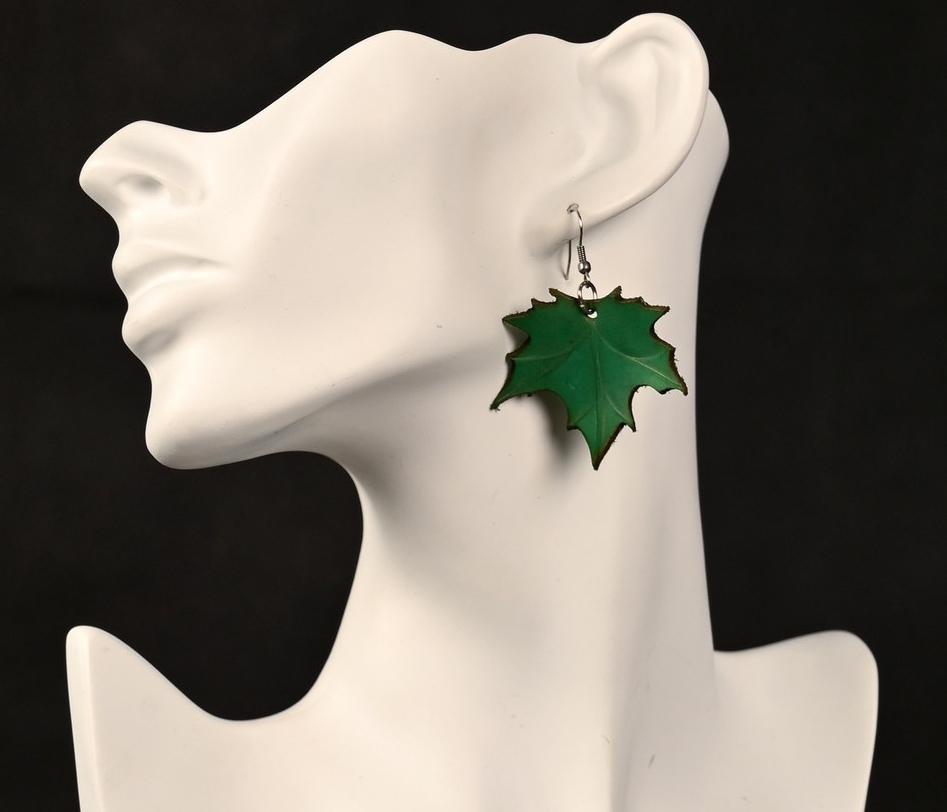 Kasviparkitusta nahasta käsin muotoillut vaahteranlehtikorvikset. Muoto on saanut inspiraationsa aidosta vaahteranlehdestä ja väreissä hehkuu ruska. Hyvin kevyet, lehden korkeus n. 3,5cm, kokonaiskorkeus koukun kanssa n. 5cm Metalliosat allergisoimatonta kirurginterästä.